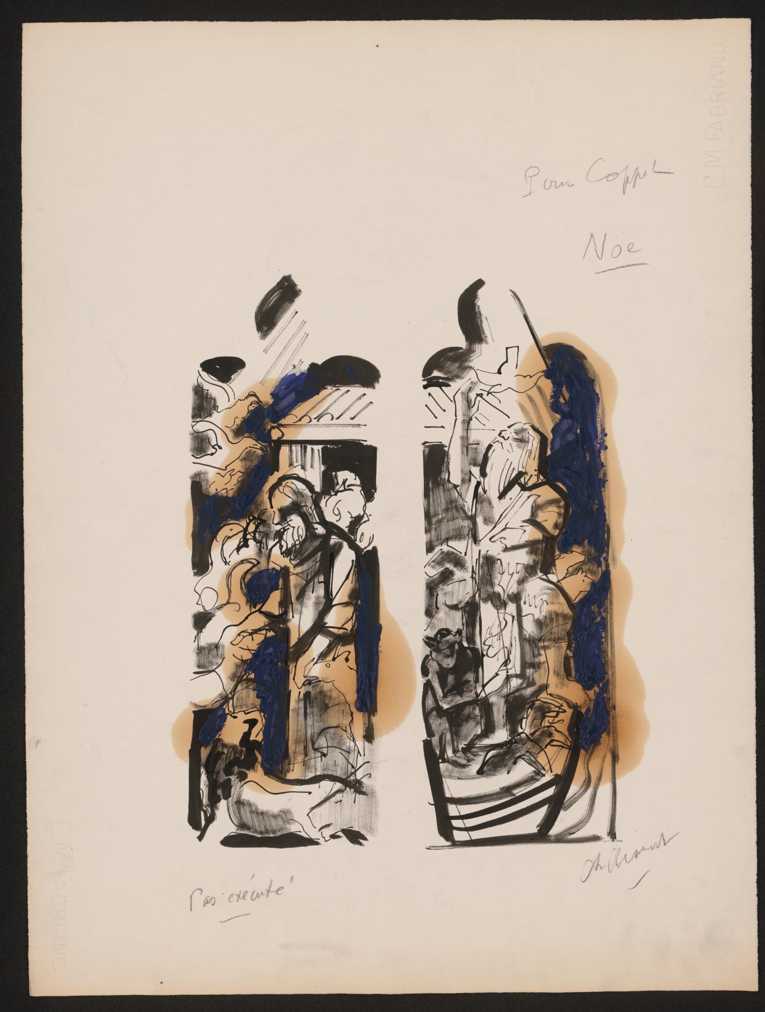 La comparaison avec le vitrail nous permet de constater que seul un des deux thèmes a été réalisé sur le vitrail (le recueil de la colombe), mais qu'il ne figure plus sur la lancette de droite comme prévu initialement mais sur celle de gauche. Le sujet de l'autre lancette a été totalement modifié. C'est un troisième dessin, le verso du CHC_052, qui esquisse les grandes lignes du sujet définitif. On y voit Noé assis, une hache dans sa main gauche et son index droit levé en direction du ciel, entouré de deux femmes et d'un enfant le montrant du doigt. Il est en train de construire l'arche dont la structure apparaît derrière lui.