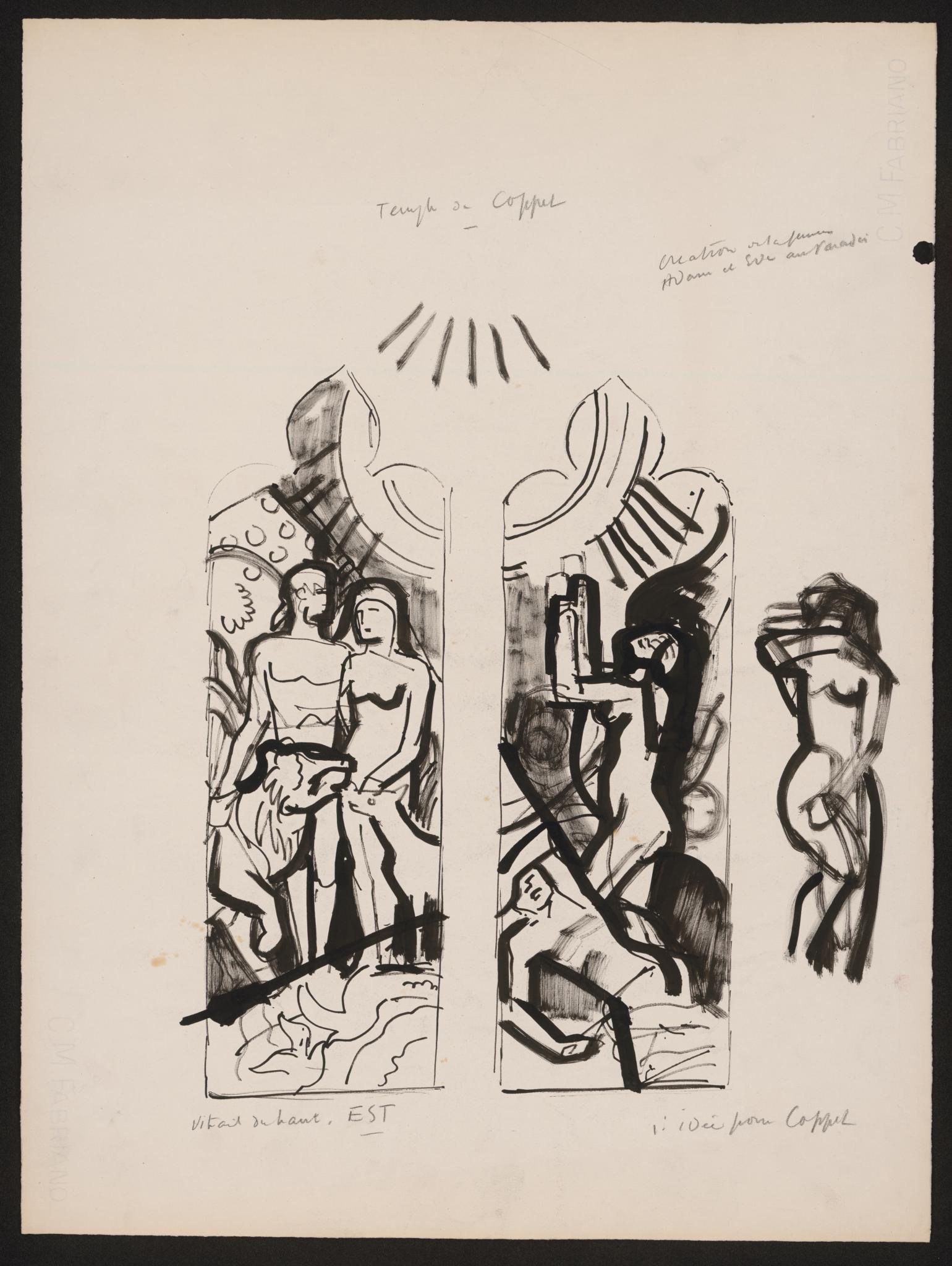 Dans le fonds graphique de l'atelier fribourgeois Kirsch et Fleckner, donné au Vitrocentre Romont en 1991, nous possédons les cartons réalisés dès 1953 pour la seconde phase créative de ce cycle de Coppet. L'oeuvre KF_1227 nous dévoile le projet définitif pour cette verrière. Nous constatons que des modifications essentielles ont été opérées pour la lancette de gauche. Les animaux qui accompagnaient Adam et Eve ont disparu et se retrouvent dans le quadrilobe du carton KF_1231. La terre au premier plan a été abandonnée et les colombes qui y volaient ont été déplacées au-dessus des deux protagonistes. Le quadrilobe au-dessus des deux lancettes qui apparaît à partir de la cinquième esquisse et présentait un soleil en son centre subsiste sur le carton mais l'artiste lui a ajouté la lune et quelques étoiles. Pour la lancette de gauche, l'essentiel esquissé sur le dernier projet se retrouve sur le carton. Seule une colombe a été ajoutée au-dessus d'Eve. Des changements aussi importants entre les dessins d'une maquette et d'un carton sont plutôt rares. Ils témoignent de la difficulté du commanditaire et de l'artiste à définir le sujet qu'ils souhaitaient voir représenter.