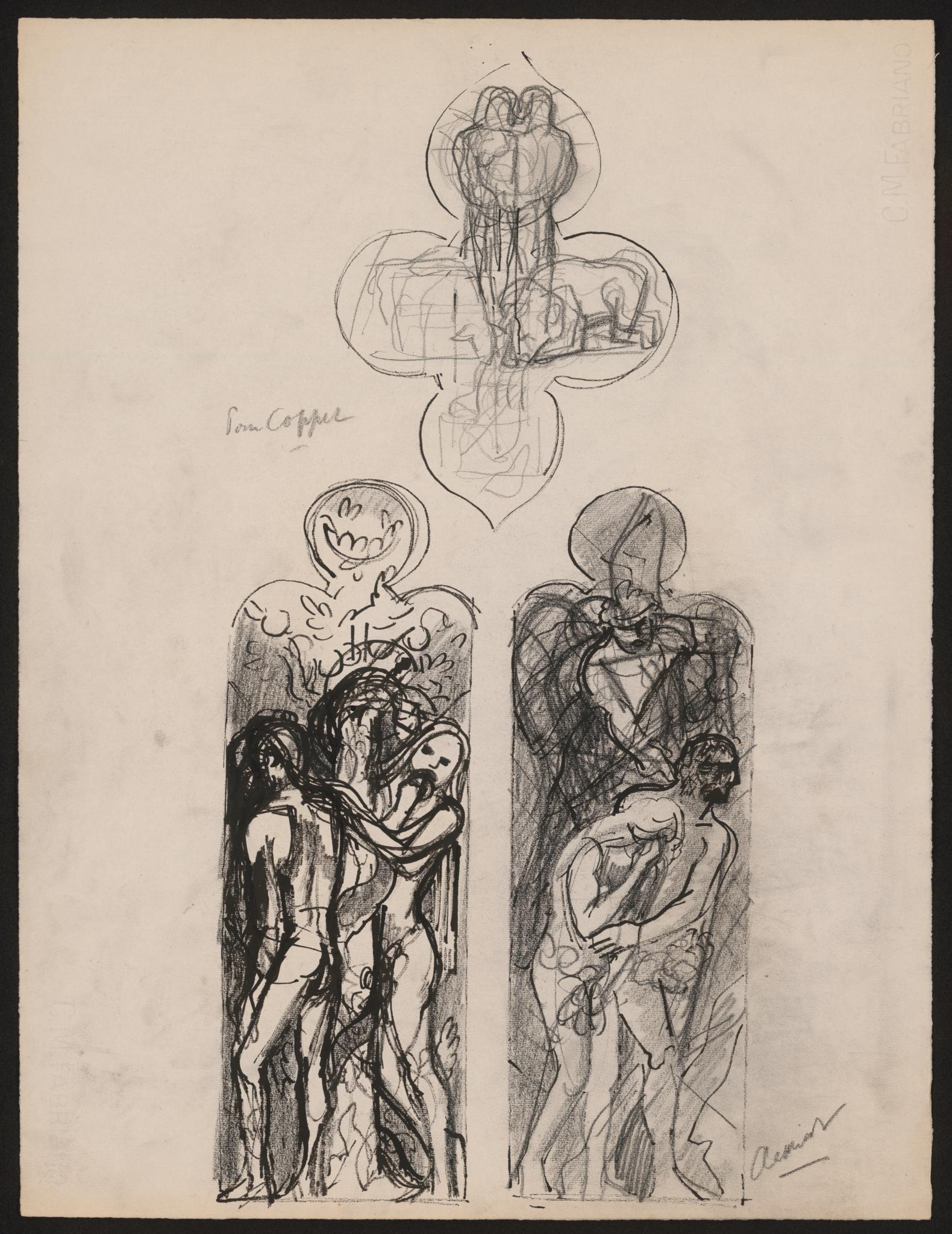 Clément a réalisé une deuxième maquette pour ce vitrail, le CHC_046, et y reprend avec plus de précisions les dessins esquissés dans celle-ci. Il est très instructif de les mettre en parallèle afin de voir comment le sujet a évolué. Il semble que l’artiste ait rapidement fixé les deux épisodes liés à Adam et Eve, à l’exception de petits détails qui ont évolué. Par contre, l’illustration dans le quadrilobe de la partie supérieure du vitrail semble avoir donné plus de peine à l’artiste. Deux variantes très différentes ont été imaginées. Pour cette maquette CHC_045, Adam et Eve, debout côte à côte, sont figurés sur le lobe supérieur et l’agneau et le lion sont à leurs pieds dans les lobes gauche et droit. Pour le dessin CHC_046, c’est le pommier qui prend place dans le lobe supérieur avec Adam et Eve assis de chaque côté de celui-ci. Seul l’agneau, couché, figure dans le lobe inférieur.
