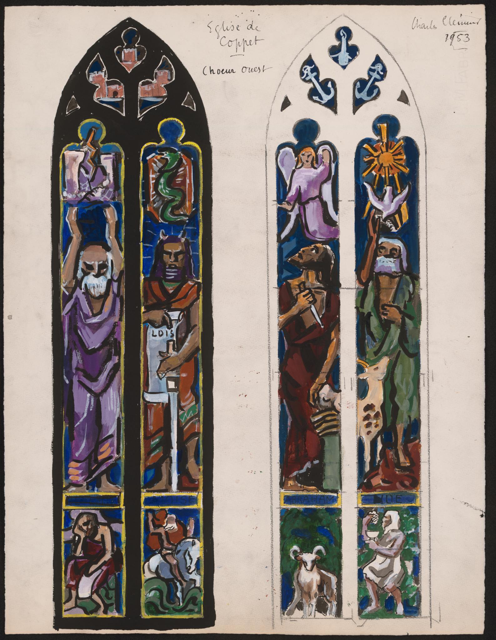 Dessin pour deux verrières à double lancettes représentant Jérémie, Moïse, Abraham et Noé.