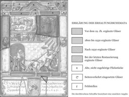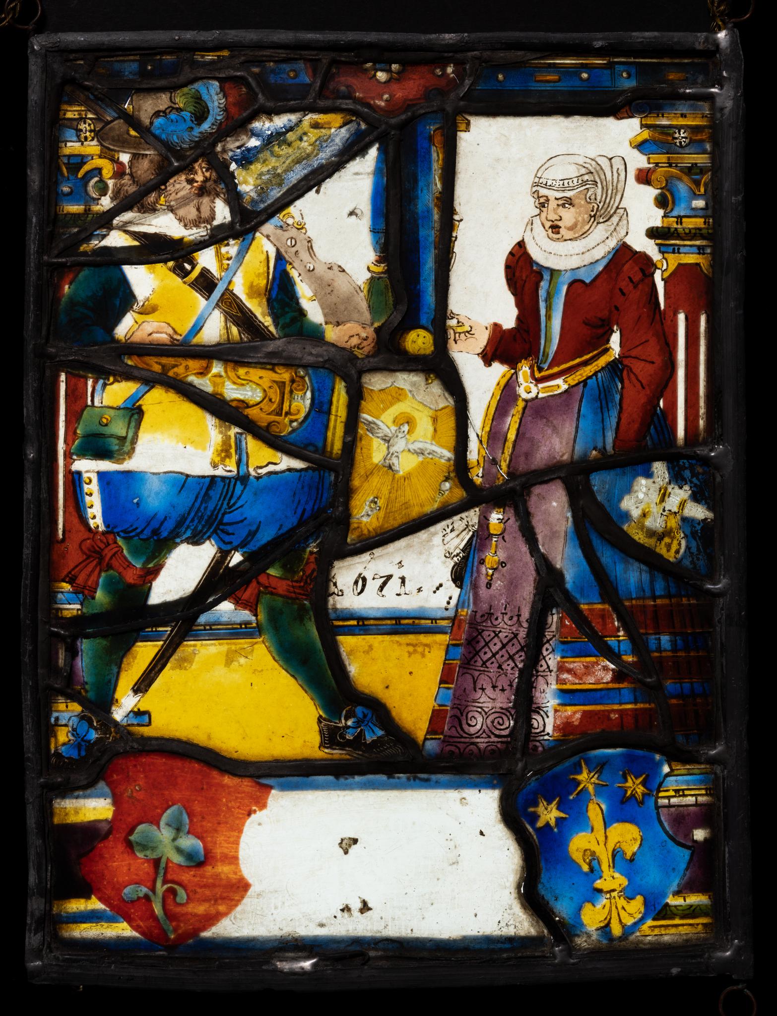 Vor weissem Grund steht das Stifterpaar auf gelbem Fliesenboden. Der in ein gelbes Wams, blaue Pluderhosen und einen Federhut gekleidete Mann trägt die Büchse geschultert. Seine ihm den Willkommenstrunk in einem Pokal anbietende Frau erscheint in blauem Rock, rotem Mieder, violetter Schürze und weisser Haube. Zwischen ihnen ist das Stiftungsdatum festgehalten. Die an der Front des Podiums angebrachte Inschrift zwischen den Wappenschilden des Ehepaares ist vollständig abgerieben und nicht mehr erkennbar.