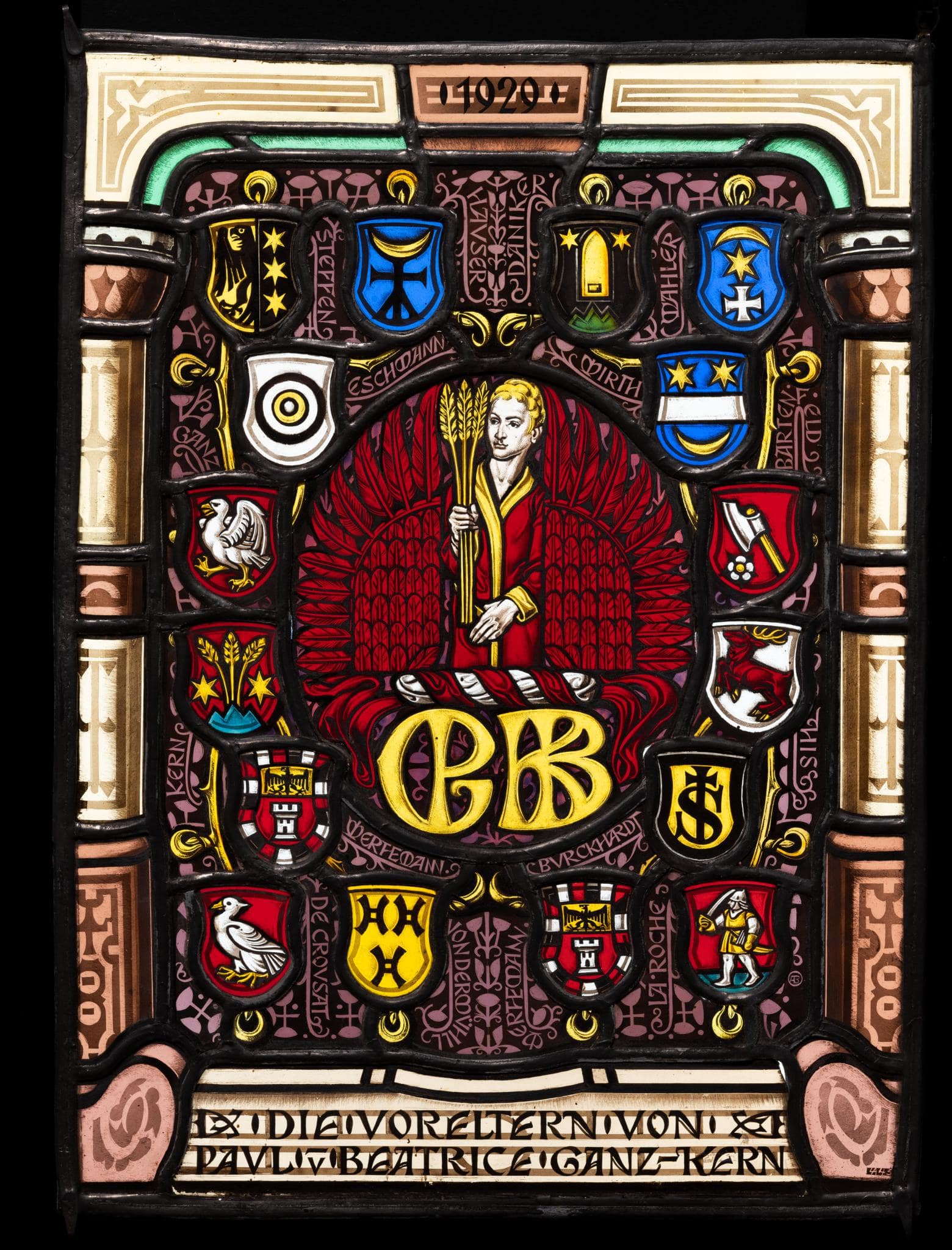 Die Wappenscheibe stifteten die „Voreltern“ (Vorfahren) von Paul Ganz und Béatrice Kern dem Ehepaar. Wahrscheinlich kam die Glasmalerei in deren Wohnhaus an der Hebelstr. 7 in Basel zur Aufstellung. Beauftragt wurde Alois Balmer aus Luzern, den Paul Ganz schon länger kannte und schätzte. Der Glasmaler hatte auch bereits ein Exlibris für die Familie Ganz geschaffen (Berger, 2016, 47; Coulin 1910/11, S. 346). Eine Besonderheit seiner heraldischen Entwürfe war, dass er aus Modernitätsgründen den Helm wegliess (Coulin, 1910/11, S. 346). So ist auch auf der vorliegenden Scheibe kein Helm dargestellt, sondern über einem rot-silbernen Wulst zwischen zwei Flügeln ein wachsender Mann mit drei Ähren in seiner rechten Hand. Obwohl die Wappenscheibe an das Ehepaar Ganz-Kern gestiftet wurde, war der Anlass dazu wahrscheinlich die Ernennung Paul Ganz’ zum Ordinarius für Kunstgeschichte an der Universität Basel.