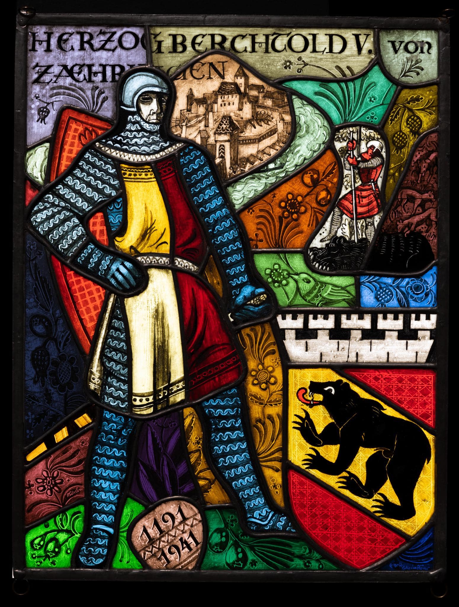 Breitbeinig steht der Stadtgründer Herzog Berchtold V. von Zähringen neben dem Bernerwappen mit Zinnenkrone. Farbige, mit Pflanzen- und Tiermotiven belegte Glasstücke bilden den Hintergrund. Dazwischen sind die Stadt Bern nach ihrer Gründung 1191 mit der Nydeggburg sowie ein herzoglicher Jäger bei der Erlegung des Bären dargestellt. Letzterer spielt auf die Gründungssage Berns an, nach der das erste erlegte Tier – ein Bär – zum Namen der Stadt geführt habe.