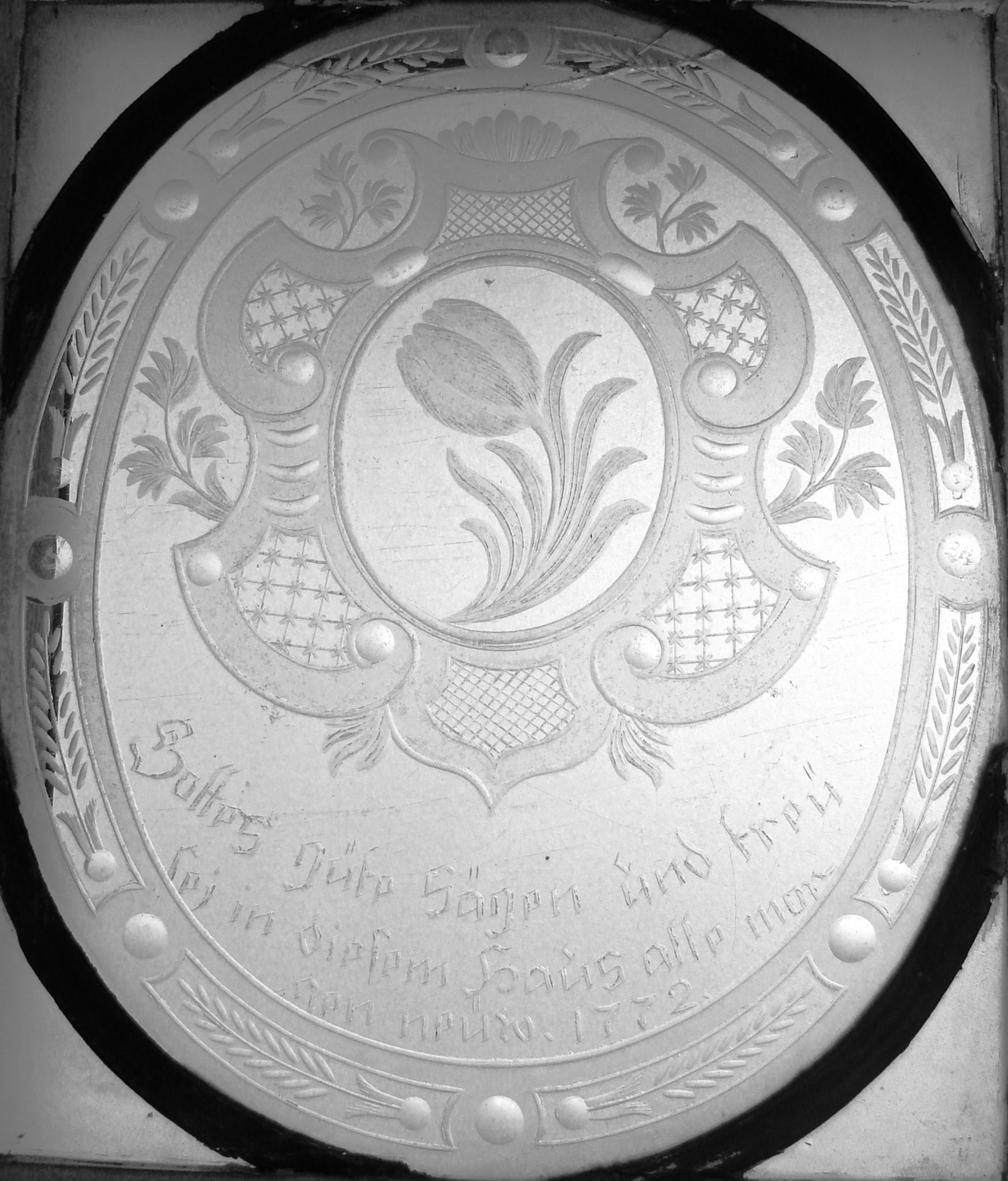Ovale Schliffscheibe mit einer Rocaillekartusche mit Gitterwerk, darin eine Tulpe. Bordüre mit Kugelungen und gefiederten Blättern.