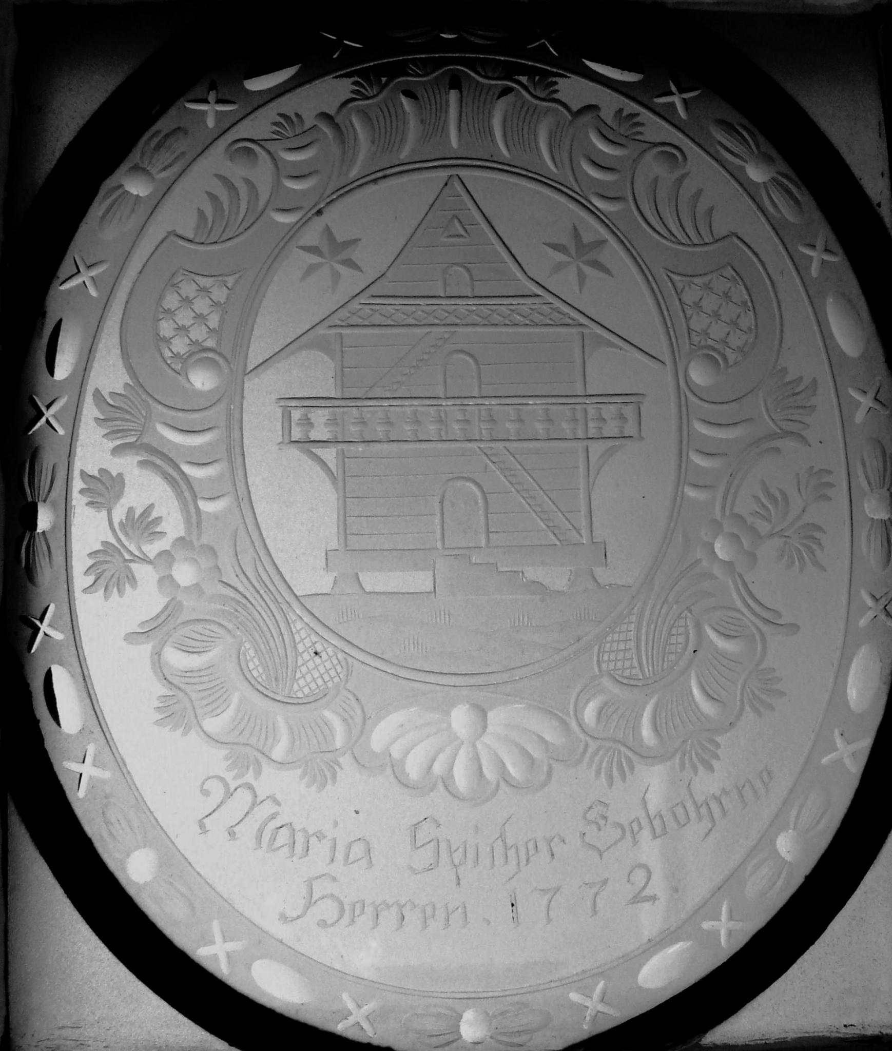 Ovale Schliffscheibe mit Rocaillekartusche mit Giterwerk, darunter die Stifterinschrift. Bordüre mit Ovalen, Kreuzchen und Rosetten, auf mattem Grund.