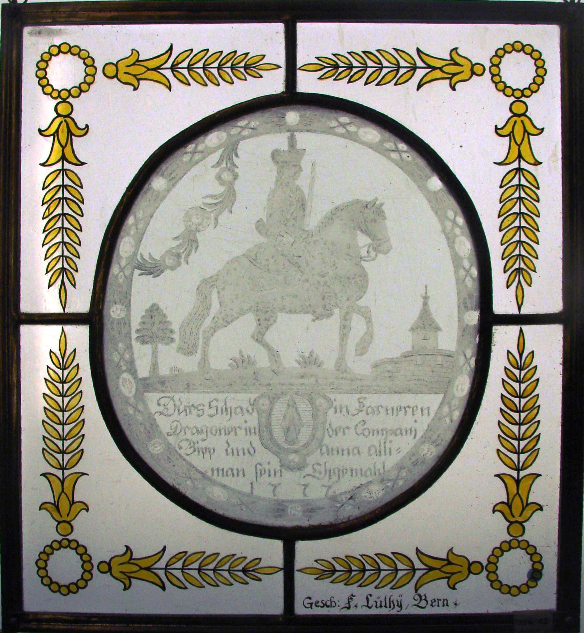 Ovale Schliffscheibe mit Darstellung eines Schwert haltenden Dragoners vor einer Landschaft mit Kirche. Am Scheibenfuss das Wappen und die Stifterinschrift. Bordüre mit Rosetten, Kreuzchen und Ovalen.