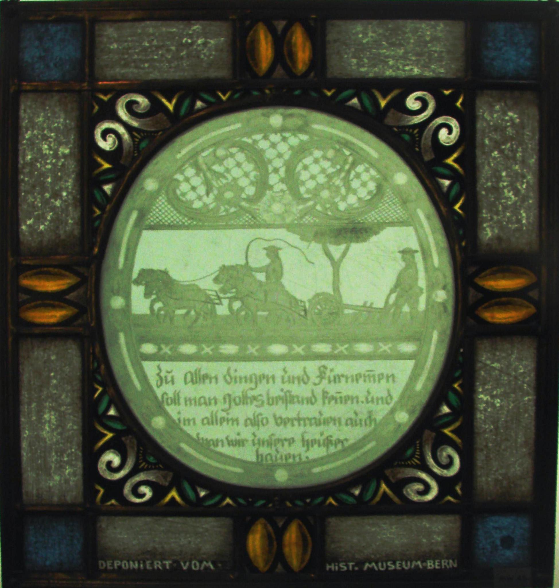 Ovale Schliffscheibe mit Darstellung eines mit vier Pferden pflügenden Bauern, daneben ein die Geisel schwingender Fuhrmann. Im oberen Scheibendrittel Rocaillen, Blumen und Sterngitterwerk, am Scheibenfuss ein Spruch. Bordüre mit Kugelungen.