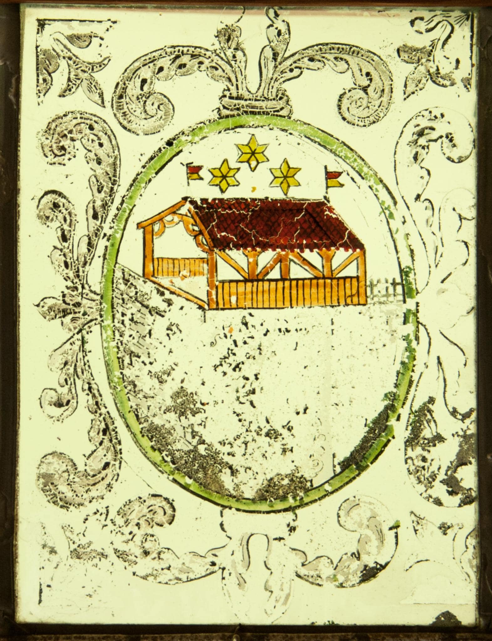 Restaurierung: 2021 Ursula Knoblauch, Bern. Ausbau der alten Wappenscheibe und Anfertigung einer Kopie (siehe Korrespondenz im Vitrocentre Romont).