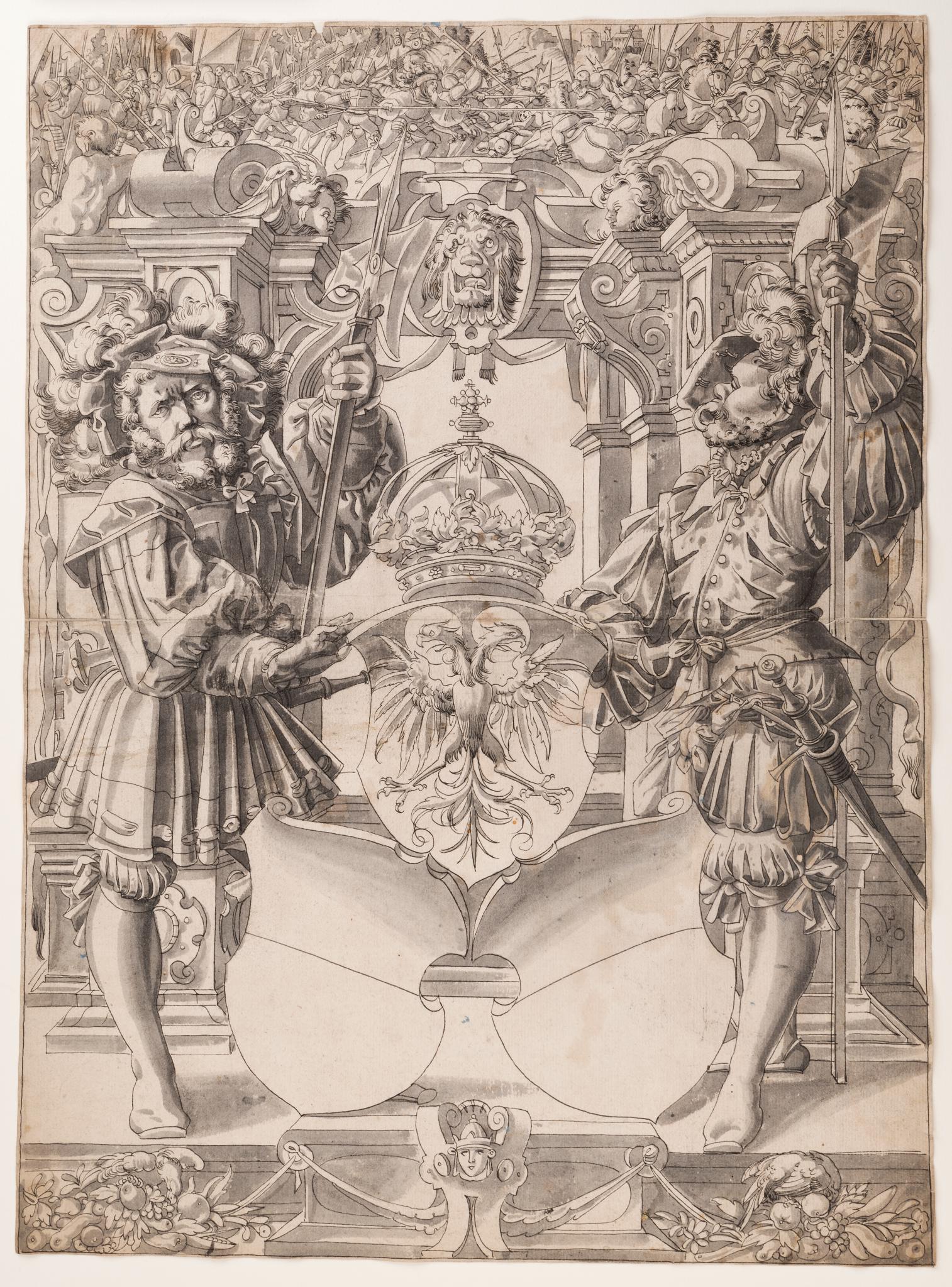 Die Freiburger Standespyramide erhebt sich über einem Podest, das an seiner Vorderfront mit an Fruchtgirlanden pickenden Vögeln sowie einer zentral vorspringenden, volutengeschmückten Stufe dekoriert ist. Sie wird von zwei Halbartieren vor einer perspektivisch fluchtenden Pfeilerarchitektur begleitet. Von den kräftigen, bärtigen Kriegerfiguren, die auf ihren Häuptern Barette mit üppigen Federbüschen tragen, ist der linke in einen breiten Waffenrock, der rechte in ein geschlitztes Wams mit Pluderärmeln und -hosen gekleidet. Über dem Architrav, dessen Mitte ein mächtiger Löwenkopf beherrscht, ist eine Schlachtenszene dargestellt, in der die Schweizer Lanzenträger den berittenen Feind in die Flucht schlagen.