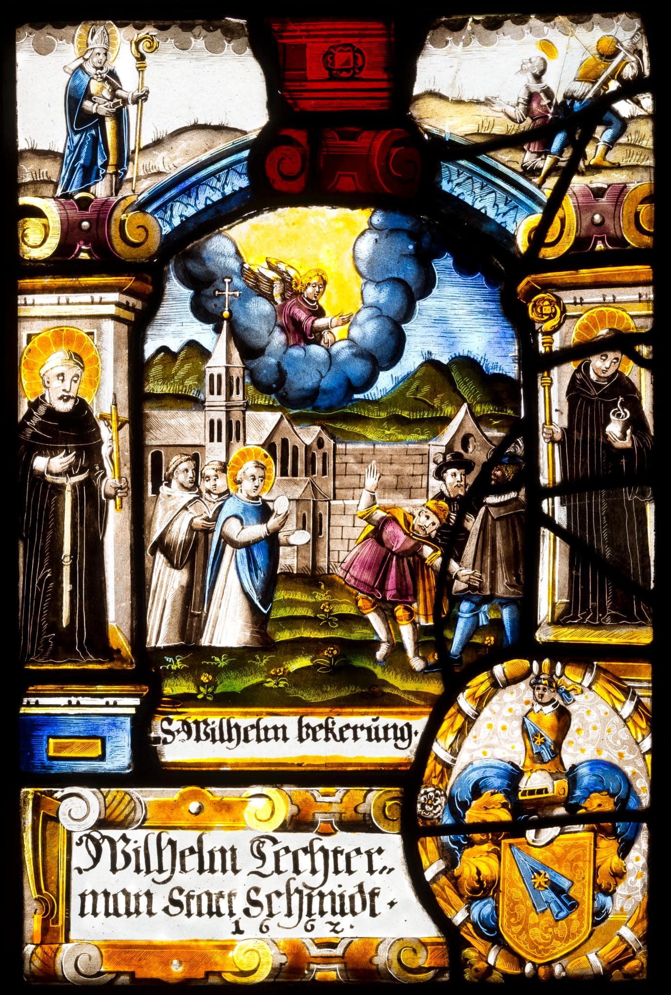 Das Mittelbild der Scheibe bezieht sich inhaltlich auf den Stifter, stellt es doch mit der Bekehrung des hl. Wilhelm von Aquitanien ein besonderes Ereignis aus dem Leben seines Namenspatrones dar. Das heilige Geschehen findet vor den Mauern eines Klosters in freier Landschaft statt. Der hl. Bernhard von Clairvaux hat das Kloster mit zwei weiteren Mönchen verlassen und hält dem in Rüstung und Waffenrock Gekleideten eine Hostie entgegen. Eine weitere Hostie bewahrt er in seiner Linken. Wilhelm krümmt sich angesichts des heiligen Leibes mit ausgebreiteten Armen vor seinen beiden ratlosen männlichen Begleitern. In den Wolken erscheint ein Engel, der sich mit einem Redegestus an den Reuigen wendet. Vor den breiten Pilastern der Rahmenarchitektur stehen zwei Mönche in schwarzem Habit: links der hl. Augustinermönch und Prediger Nikolaus von Tolentino mit dem Kruzifix, rechts der hl. Benedkt von Nursia, Gründer des Benediktinerordens, mit dem Glas, aus dem das Gift in Form einer Schlange entweicht. Über dem Bogen sind, geteilt durch eine rote Kartusche, in den Zwickeln die heiligen Augustinus und Mauritius als Patrone des Klosters und Konvents der Augustinereremiten in Freiburg dargestellt. Der hl. Augustinus hält den Bischofsstab und ein Buch mit dem brennenden Herzen als Zeichen seiner Gottesliebe. Der hl. Mauritius wird in freier Landschaft von einem Henker enthauptet.