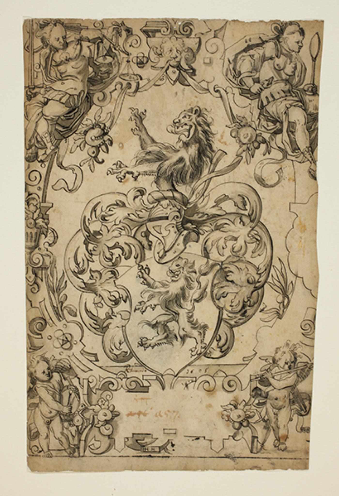 Das zentrale Wappen wird von einem ovalen Rollwerkrahmen eingefasst. Die Eckfelder zeigen oben zwei der vier Kardinaltugenden: links die Justitia (Gerechtigkeit) und rechts die Prudentia (Klugheit). Unten neben der Inschriftenkartusche sind zwei musizierende Engel dargestellt.