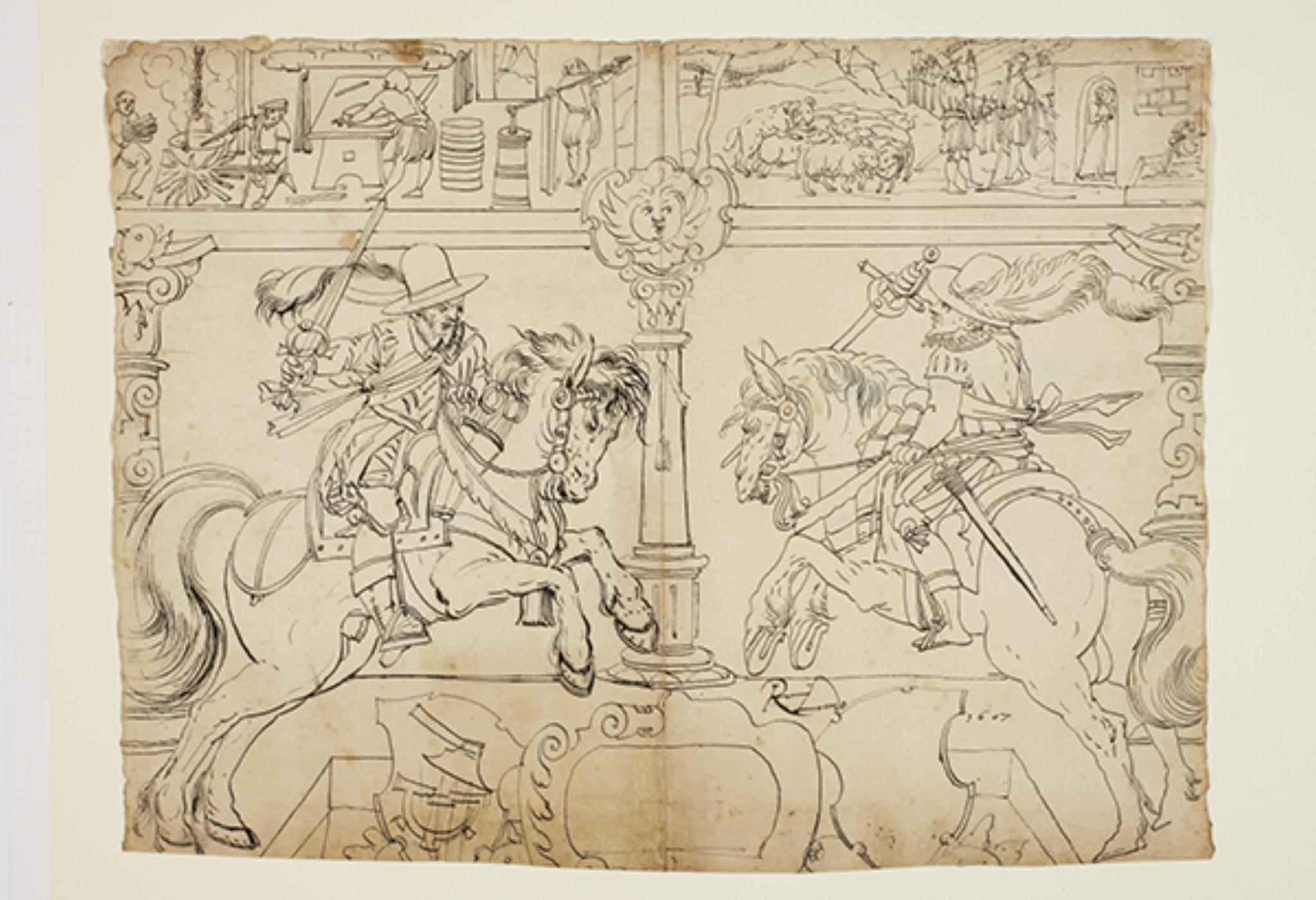 Die zwei aufeinander zugaloppierenden Reiter auf den sich aufbäumenden Pferden zeigen ausserdem Ähnlichkeiten mit einem Scheibenriss im British Museum London (1899,0120.52, SR_33). Die Beischrift auf diesem belegt, dass Lando das Blatt 1605 in Schaffhausen gekauft hat. Dieses Blatt hat sich wohl 1607 noch in Besitz Landos befunden. Es liegt folglich nahe, dass sich Lando von der Komposition und der Lebendigkeit der Pferde für die eigene Zeichnung inspirieren liess (Gartenmeister 2019. S. 69).