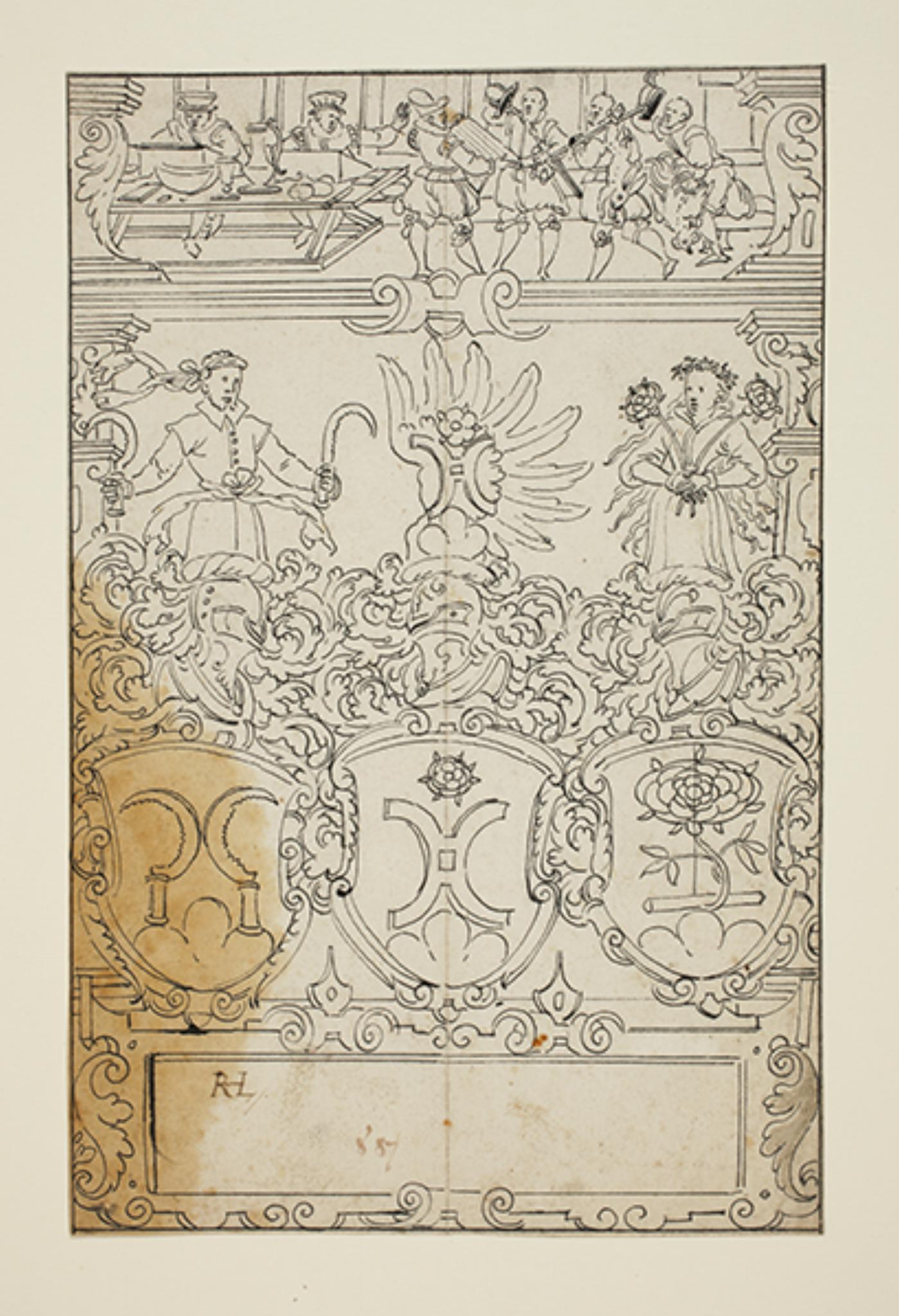 Der Entwurf ist in einfachen Tintenstrichen gezeichnet, nur rechts unten ist ein Ornamentelement der Rahmung laviert.