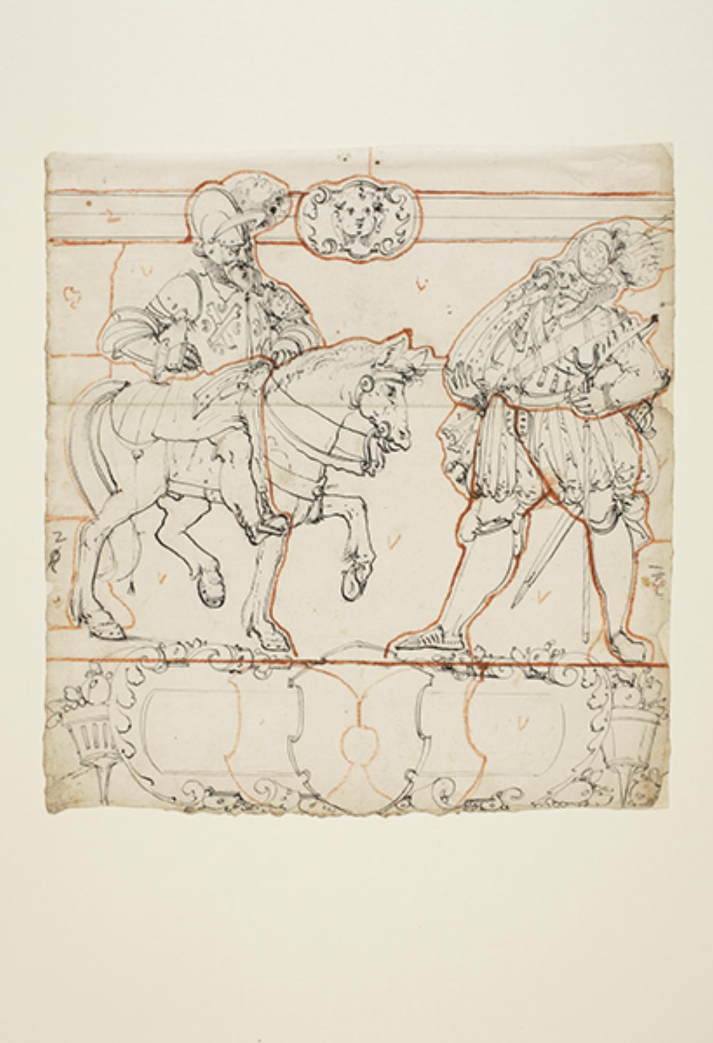 Vor leerem Hintergrund steht links ein Stifter in Pluderhosen und Wams und rechts sitzt ein Ritter in Rüstung auf einem Pferd. Der stehende Stifter hat seine Muskete geschultert. Sein Gegenüber auf dem Pferd hat die Sturmhaube aufgesetzt und trägt auf dem Brustharnisch das Burgunderkreuz.
