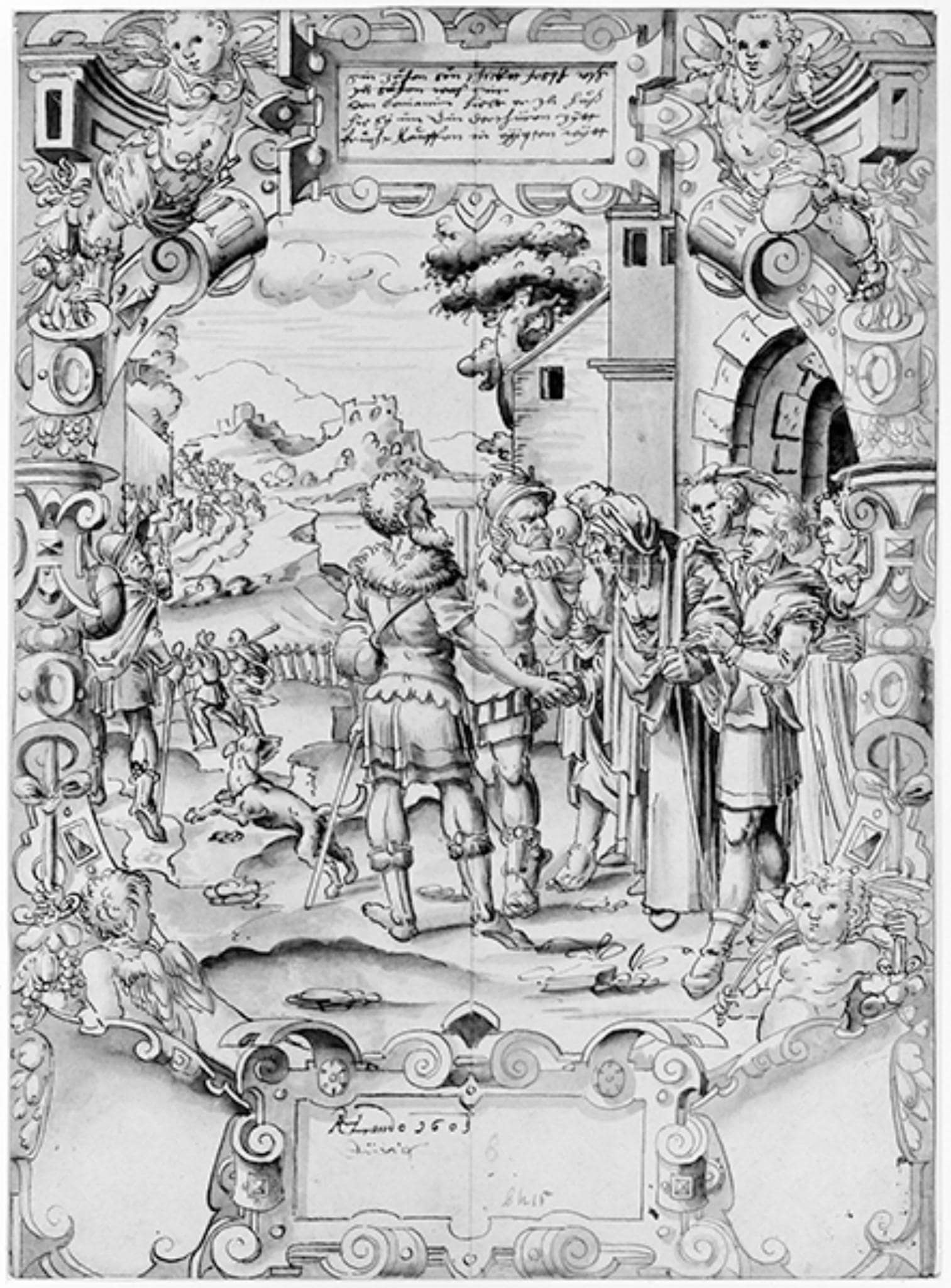 Als Vorlage für die Darstellung der Erzählung diente dem Zeichner einen Holzschnitt Tobias Stimmers aus den "Neuen und Künstlichen Figuren Biblischer Historien" von 1576 (Stimmer 1576, S. [47]). Zwei weitere Zeichnungen des Zyklus (SNM 24692 und SNM 24693) gehen ebenfalls auf dieses Werk zurück.