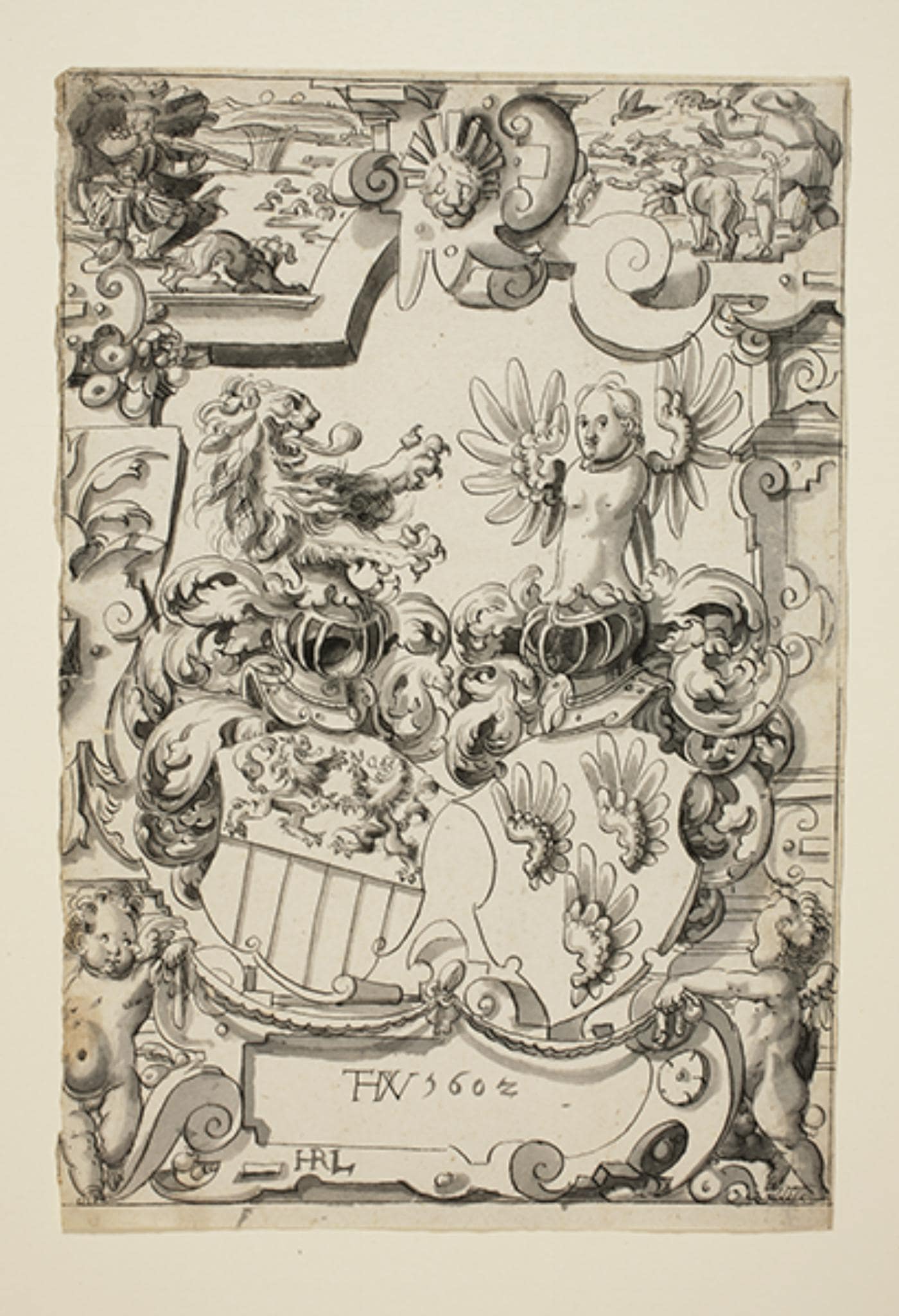Von Paul Leonhard Ganz wurde der Entwurf Bernhard Herzog zugeschrieben (Ganz 1996, S. 89). Die Zeichnung zeigt die gleichen stilistischen Merkmale, wie die kräftige, frei über die Konturen geführte Lavierung, auf, wie z. B. der signierte Riss des Meisters im Kupferstichkabinett des Kunstmuseums Basel (U. I. 167). Zwischen 1584 und 1587 sind einige Risse Herzogs mit Jagdszenen in den Oberlichtern erhalten, z. B. der bereits erwähnte Riss im Kupferstichkabinett Basel (Inv. U. I. 167) oder ein Entwurf in der Sammlung Wyss im Bernischen Historischen Museum (BHM 20036.415) (Hasler 1996/1997, 1. Bd. S. 125).