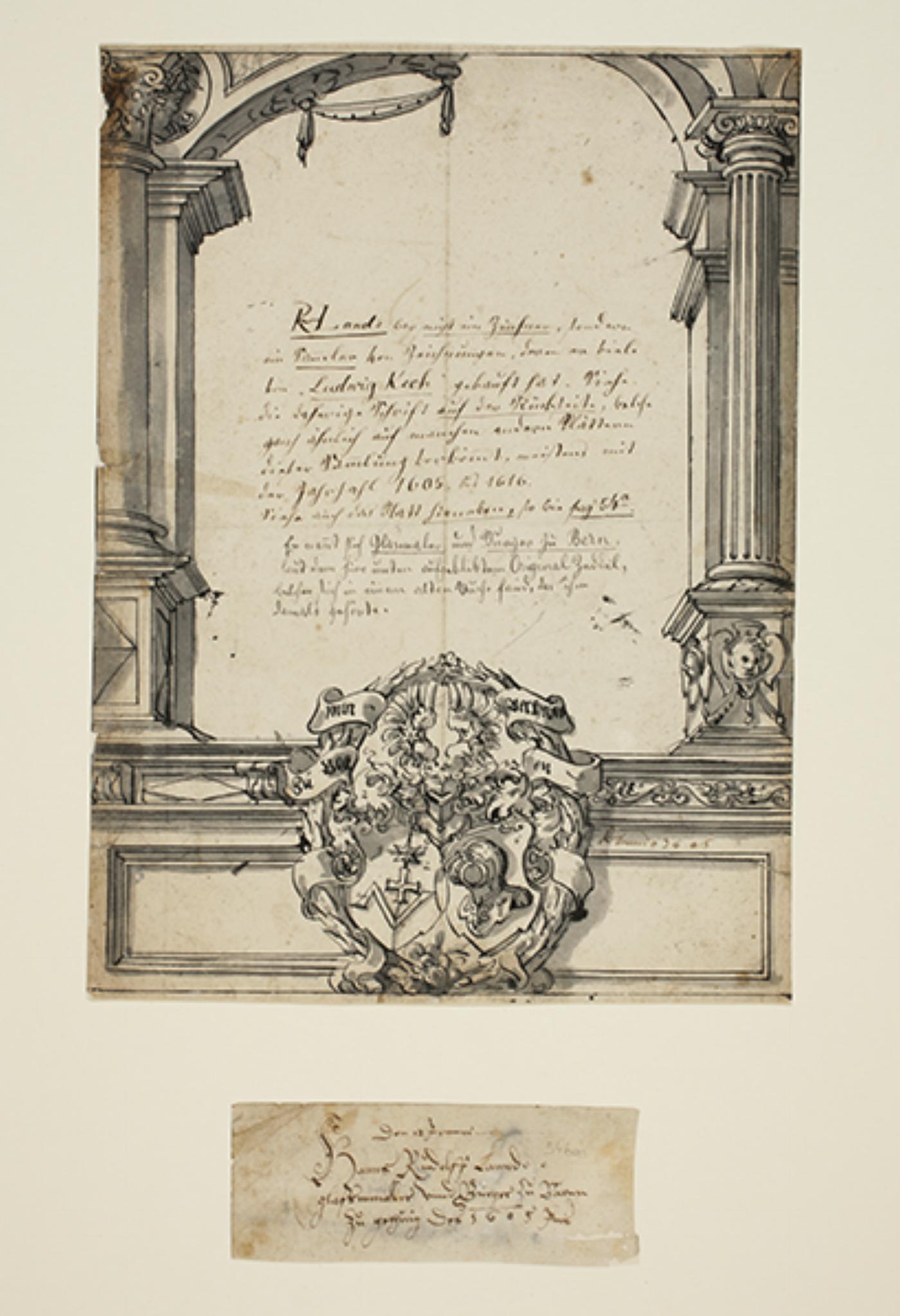 Auf dem Spruchband beim Wappenkranz: "Zů Gott min verthruwen". Farbangaben. Im leeren Mittelfeld: in Braun "HRLando war nicht ein Zeichner, sondern / Ein Sam̄ler von Zeichnungen; deren er viele / von "ludwig Koch" gekauft hat. Siehe / die daherige Schrift auf der Rückseite, welche / ganz ähnlich auf manchen anderen Blättern / dieser Sam̄lung vorkom̄t, meistens mit / der Jahreszahl 1605. bis 1616. / Siehe auch das Blatt hieneben, so wie pag 54a." und daran anschliessend in Graubraun "er nen̄t sich Glasmaler und Burger zu Bern, / laut dem hier unten aufgeklebtem OriginalZeddel, / welcher sich in einem alten Buche fand, das ihm / damals gehörte". Rechts neben dem Wappenkranz in Braun: "HRLando 1605". Auf der Rückseite: in Braun "Erkauffdt von Ludwig Koch durch mich HRLando 1605 Jars", "... CF 1515" und hin Hellbraun "Meinem geliebten...".