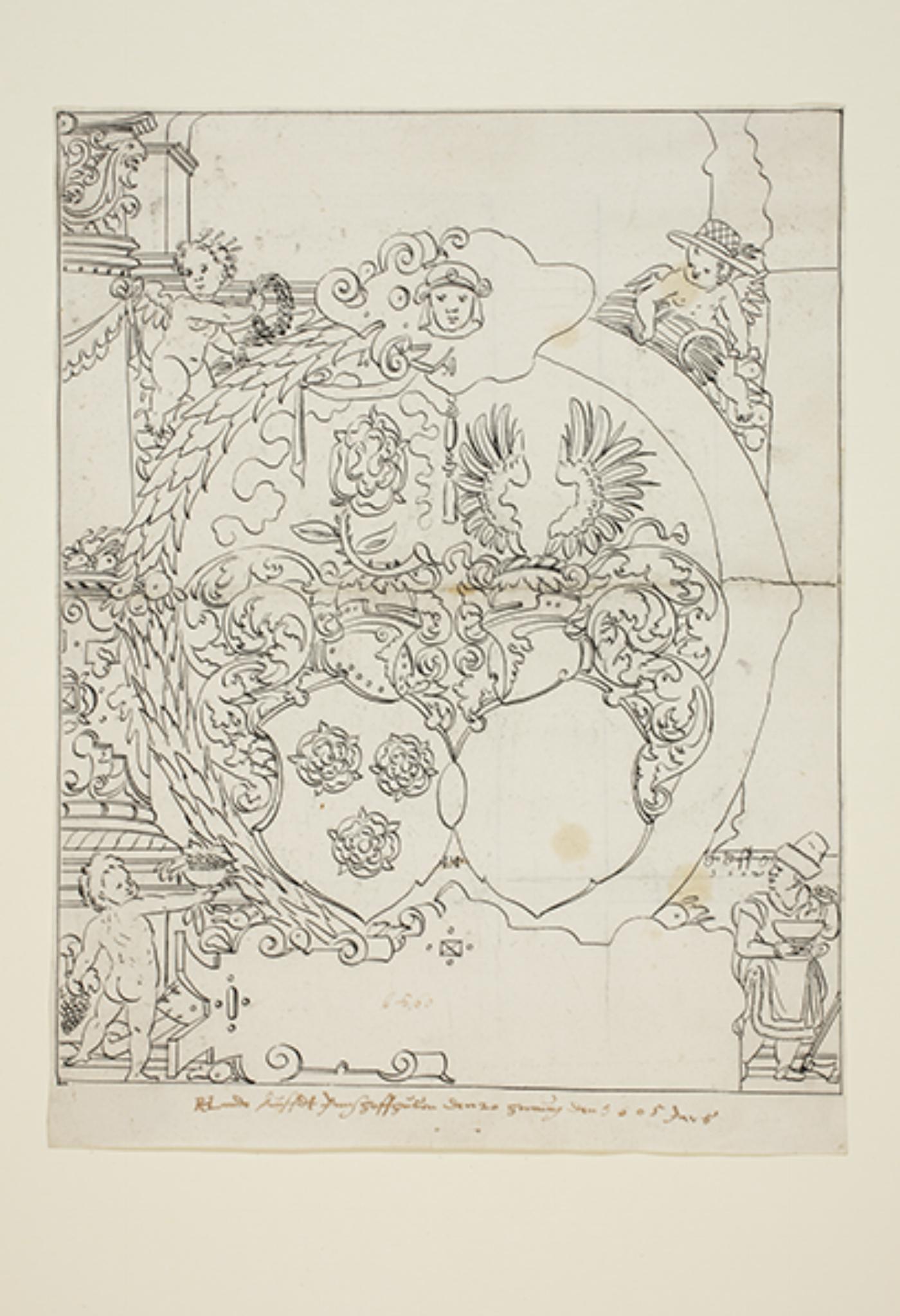 Bei der Figur des Winters: "In Zoffingen / 1602". Zwischen den beiden Wappen: "IM" (in Braun durchgestrichen). Am unteren Rand in Braun: "HRLando kauffdt Inn Schaffhusen den 20 Hornung des 1605 Jars". Auf der Kartusche in Hellbraun: "bs 60".