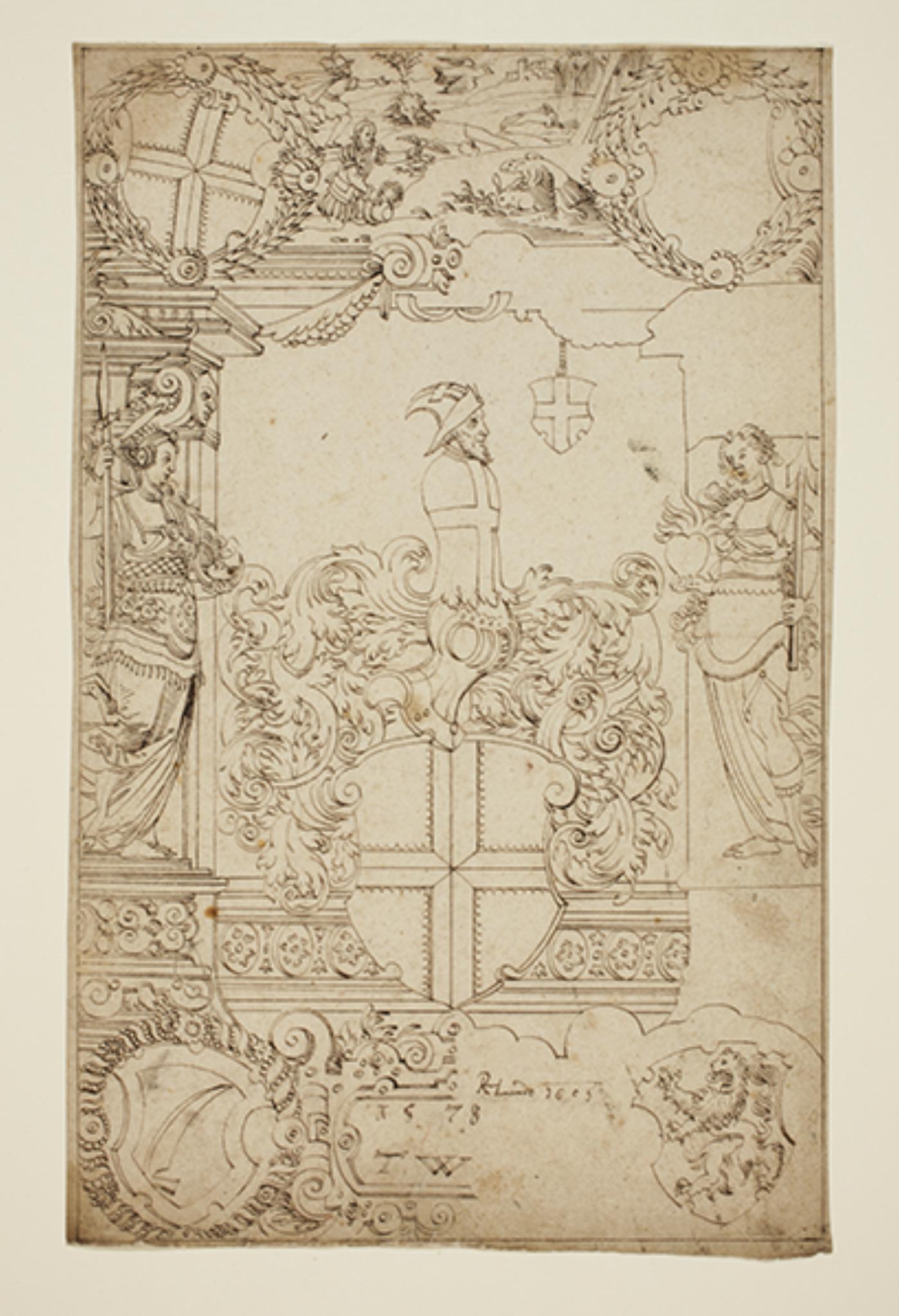 In der Kartusche steht das Jahr und das Monogramm TW. Auf dem nicht ausgeführten rechten Rahmen der Kartusche hat Hans Rudolf Lando seinen Besitzervermerk angebracht. Auf der Rückseite gibt er zusätzlich den Verkäufer des Risses, Ludwig Koch, an.