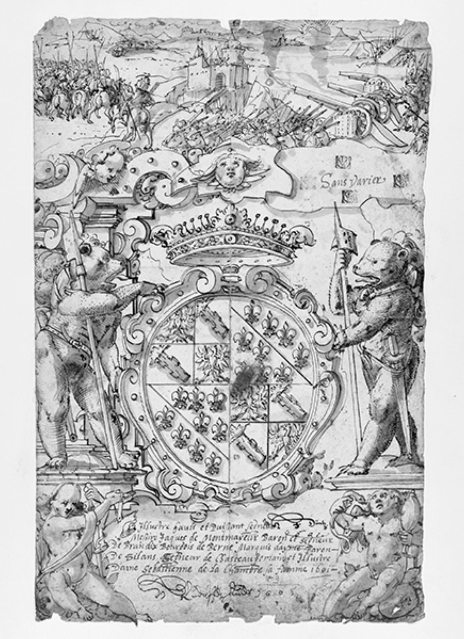 In der Rahmung links: "Sans Varier". Um die Inschrift vier Mal der Stempel "CDV" oder "CBV". In der Kartusche unten: "Illustre hault et puißant segrieur Meßire Jaques de Montmayeur Baron et segrieux de Brandis dix Bourgois de Berne Marquis deyme Baron De Silans Segneur de Chasteau domaine et et Illustre Dame Sebastienne de la Chambre sa famme 1601". In der Kartusche unterhalb des Wappens in dunkler Tinte: HJDüntz 1601". Am unteren Rand: "HRudolff Lando 1605".