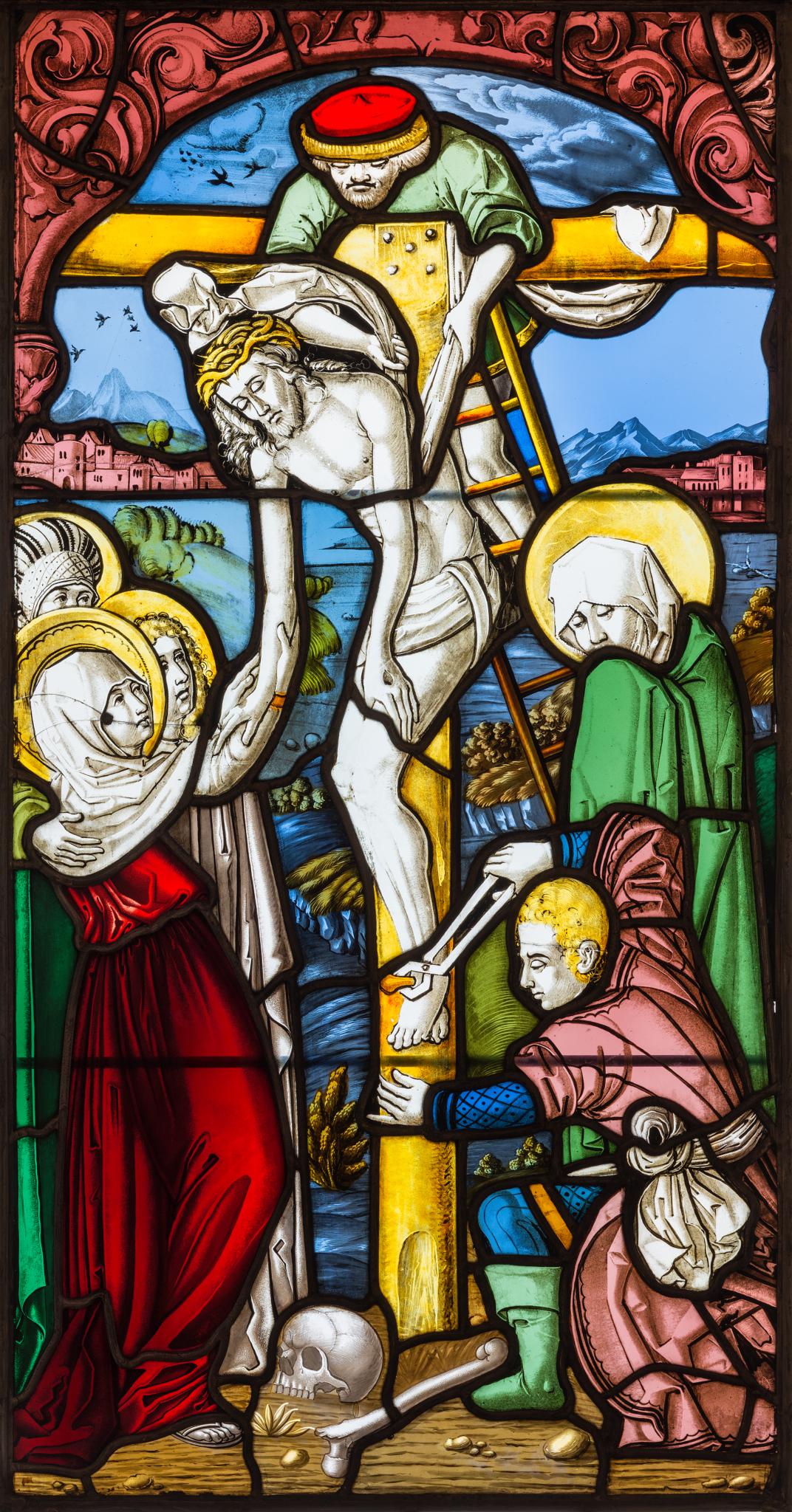 Unter einer Arkade die Kreuzabnahme Christi. Landschaftshintergrund.