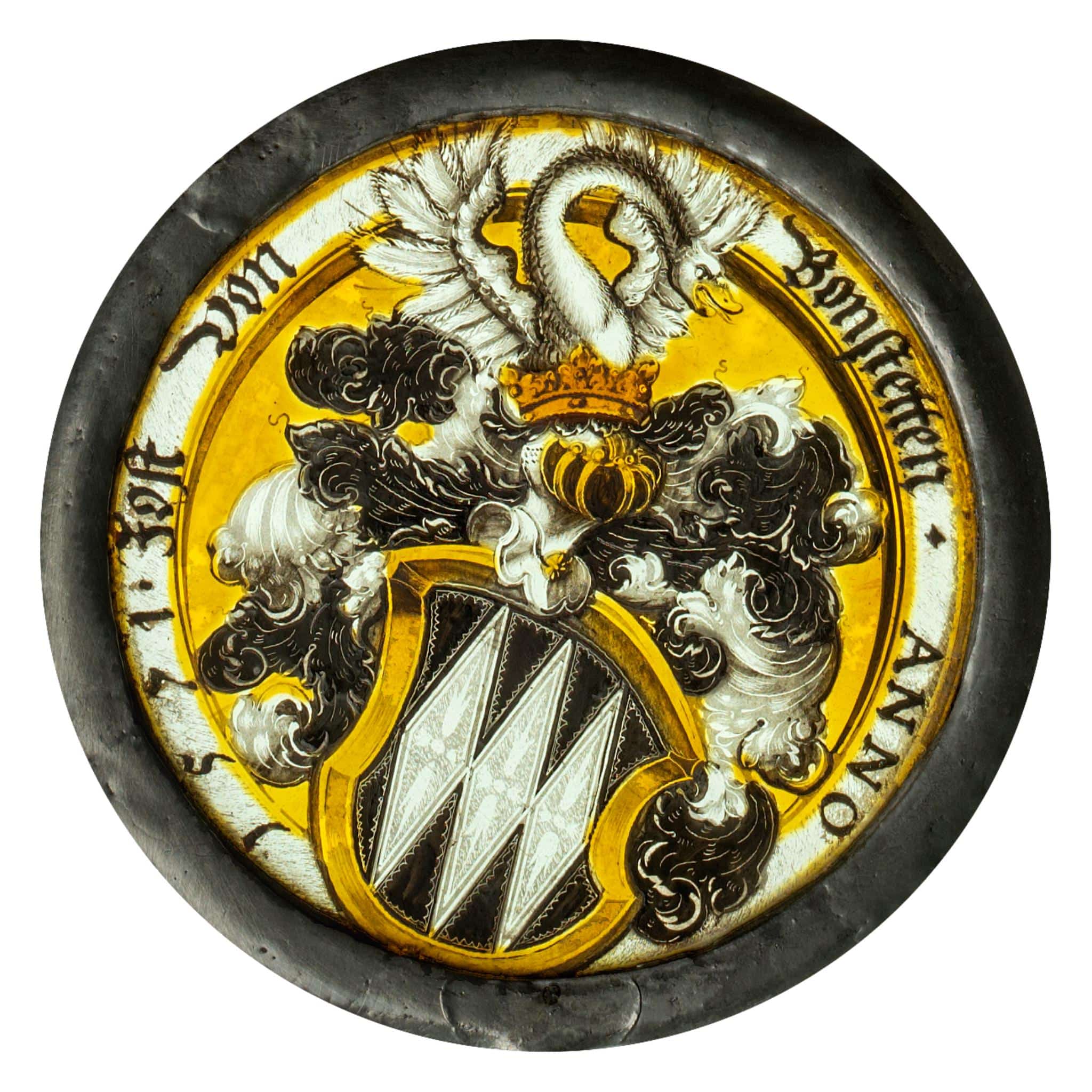 Monolithscheibe aus farblosem Glas, Bemalung mit Schwarzlot und Silbergelb.