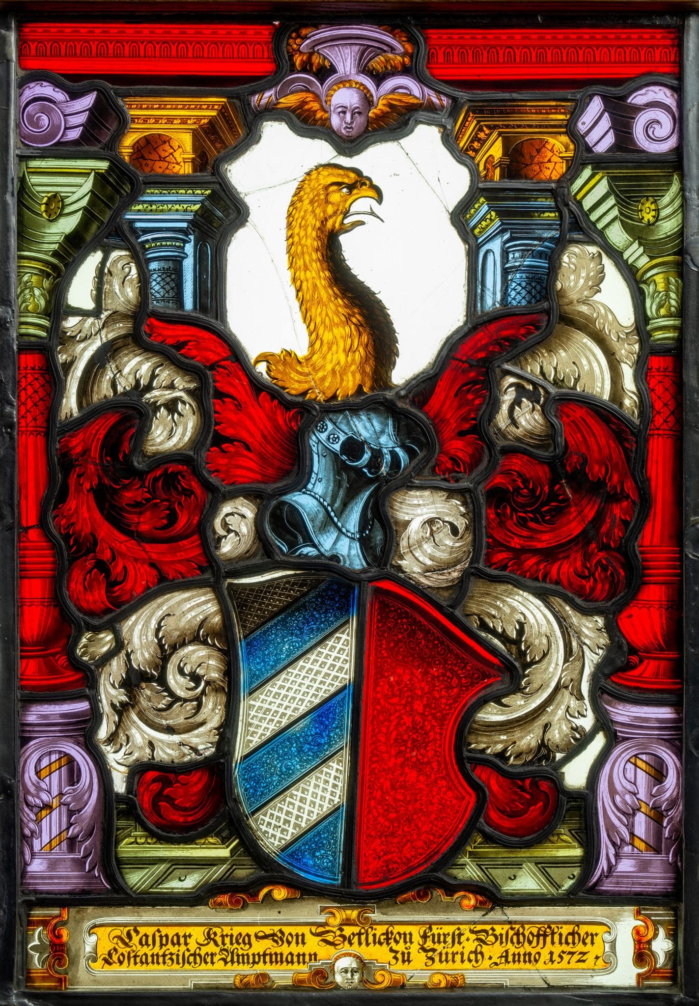 Wenn die Inschrift historisch korrekt ergänzt ist, handelt es sich um eine Stiftung von Kaspar Krieg (†1605), Sohn des Jakob, von Bellikon von Zürich, der dort seit 1570 als bischöflich-konstanzischer Amtmann wirkte (Historisch-biographisches Lexikon der Schweiz, 1921–34, Bd. 4, S. 546).
