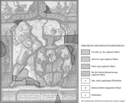 Einige Ergänzungen, zahlreiche geklebte Sprünge, die Verbleiung erneuert.
