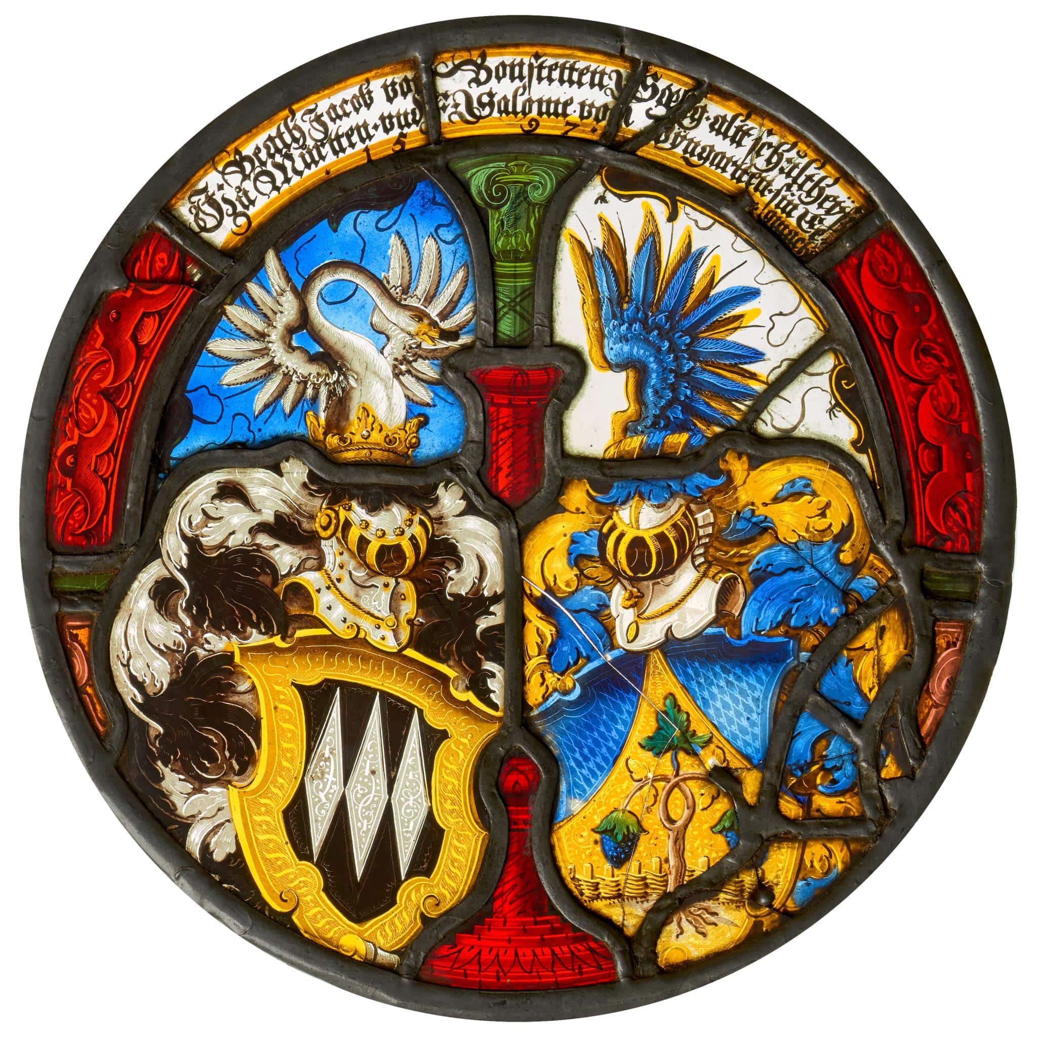 Hasler, R., Keller, S., & Tomaschett, M. (2020). Runde Allianzwappenscheibe Beat Jakob von Bonstetten und Salome von Wingarten. Dans Vitrosearch. Consulté le 5 décembre 2025 de https://www.vitrosearch.ch/objects/2646408.