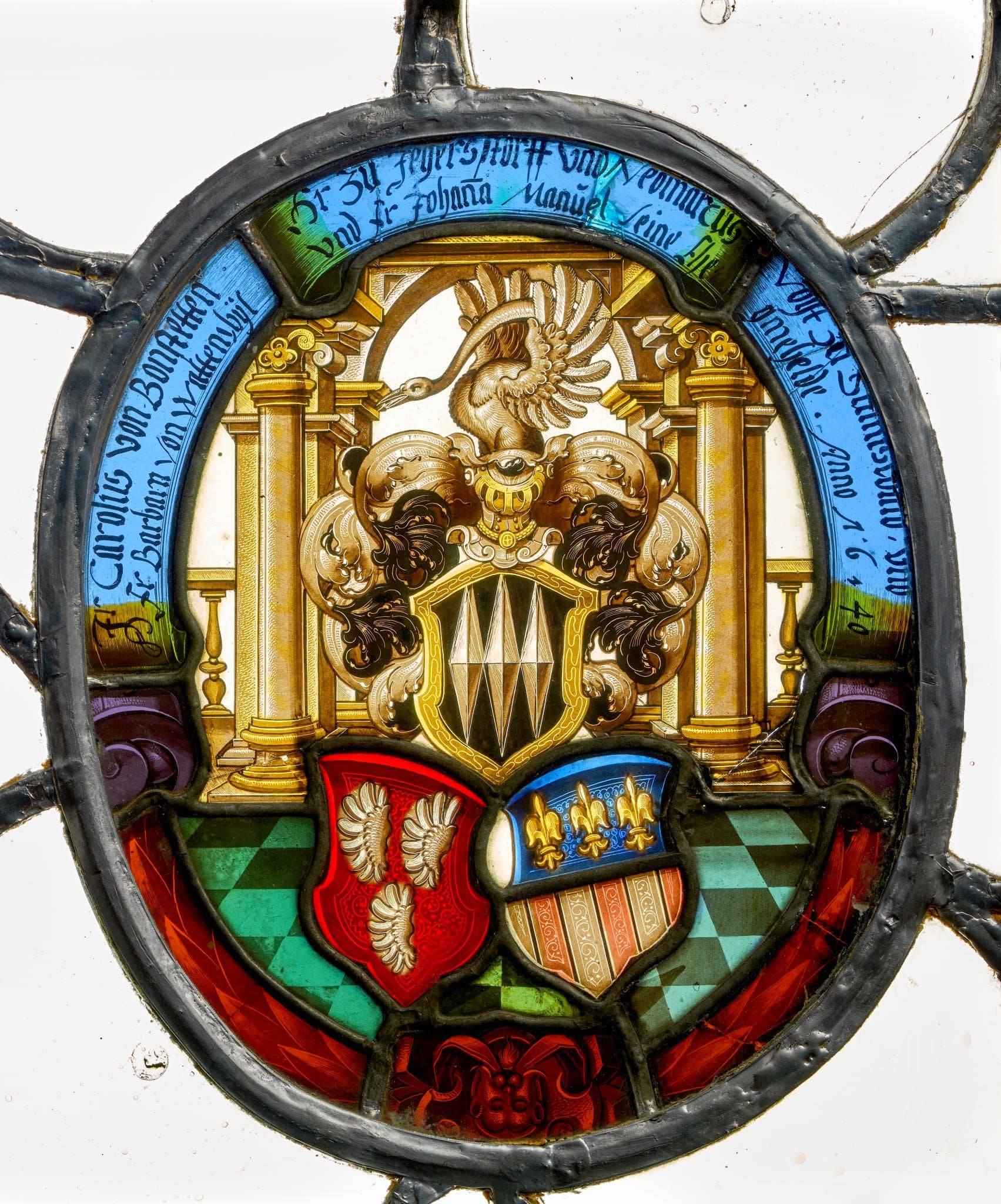 Karl von Bonstetten ist mehrfach als Scheibenstifter dokumentiert (vgl. BE_59). Ausserdem befanden sich in der Sammlung Reding in Schwyz vormals Scheibenkopien aus der Zeit um 1900, worauf einerseits die Allianzwappen des Karl von Bonstetten und der Barbara von Wattenwyl sowie andererseits diejenigen von Karls Vater Ulrich von Bonstetten und dessen Gemahlin Anna von Neuenburg (1564–1625) festgehalten sind (Messikommer, 1911, Nr. 1, Nr. 5)