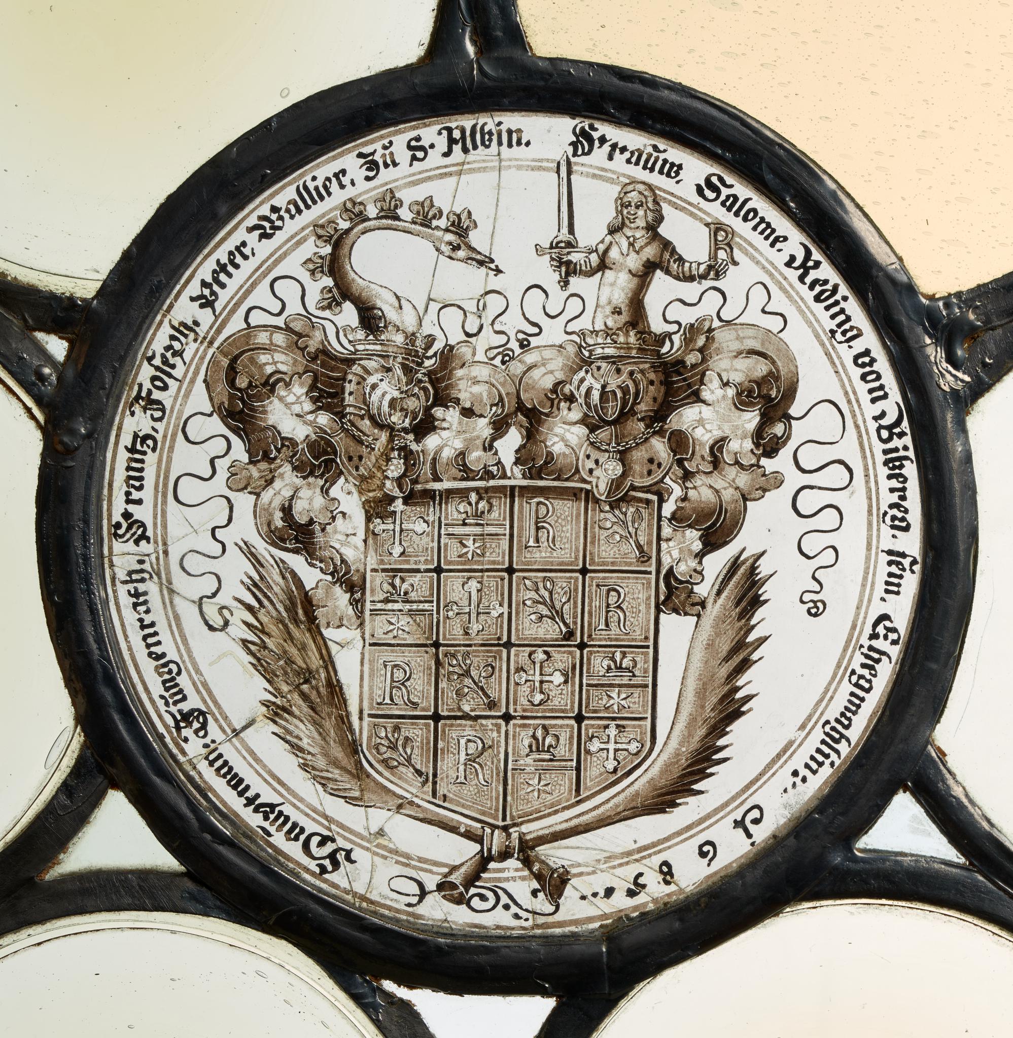 Franz Joseph Peter Wallier (1653–1696), Sohn des Peter und der Veronika Sury, gehörte zum engsten Führungskreis des Solothurner Patriziats. Er war 1678 Vogt zu Flumental, 1680 Jungrat, 1689 Altrat und Bürgermeister, 1691 Vogt zu Lebern, Herr zu Saint-Aubin, das er 1691 an Fribourg verkauft, 1695 Vogt zu Kriegstetten sowie Hauptmann in französischen Diensten (Historisch-biographisches Lexikon, 7/1933, S. 33). 1676 heiratete er Salome Reding (1659–1714), Tochter des Heinrich Friedrich (1624–1698), Besitzer des Ital-Reding-Hauses in Schwyz. Ihre Scheibe von 1685 stammt wohl aus einem Gebäude rund um Solothurn.