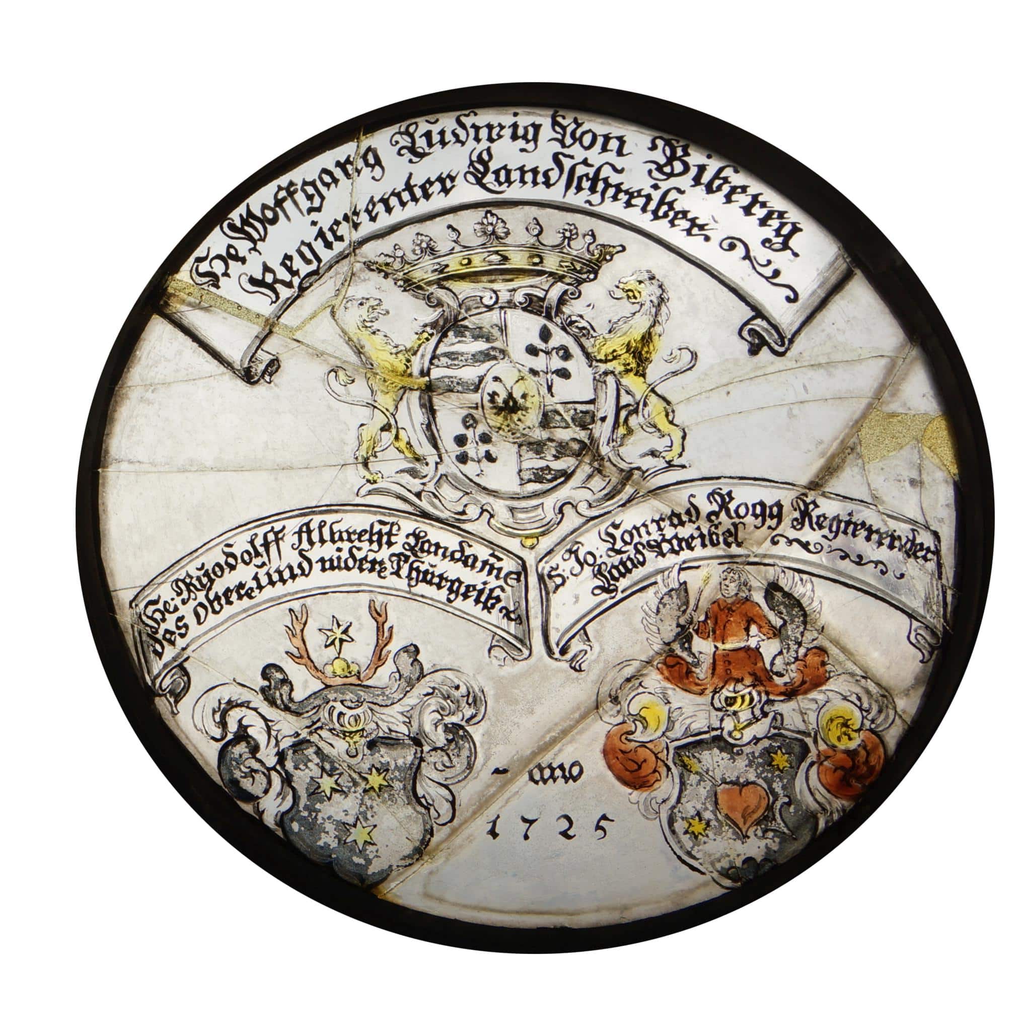 Freiherr Wolfgang Ludwig Reding (1700–1760), Sohn des Sebastian Anton und Enkel des Wolfgang Rudolf (vgl. SZ_48), wirkte als Thurgauer Landschreiber. In dieser Funktion, die er von 1720 bis zu seinem Tod innehatte, stiftete er 1725 zusammen mit Rudolf Albrecht (1669–1731), der 1718–1728 das Amt des thurgauischen Landammanns ausübte, und Landweibel Johann Conrad Rogg (†1727) eine runde Monolithscheibe. Zusammen mit einer Scheibe der Stadt Steckborn von 1726, einer der Gemeinde Berlingen sowie einer von Elias Geiger, Landgerichtsdiener in Ermatingen, und seiner Frau Esther Bigler von 1725 befand sich die Rundscheibe bis 1917 als Teil der Sammlung Carl Bürgi-Treschers in der 1830 erbauten Schlosskapelle Wolfsberg bei Ermatingen im Thurgau (vgl. Briefe im Familienarchiv Haus Reding; Raimann/Erni, 2001, S. 22, 419; Abegg/Erni/Raimann, 2014, S. 172).
