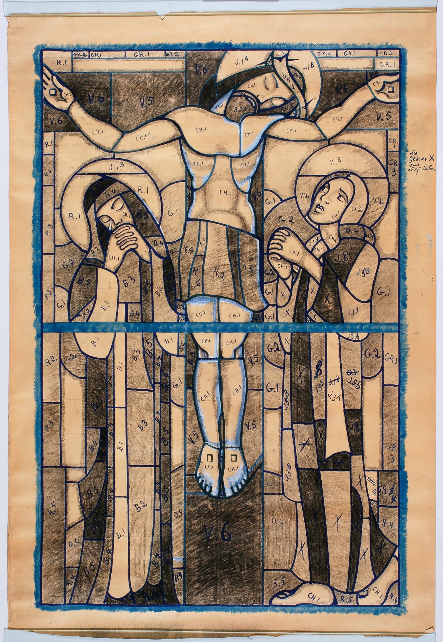 Ce carton en noir et blanc à l’échelle 1:1 est le projet définitif pour la deuxième scène depuis le haut du septième vitrail à gauche de la nef de l’église Saint-Pierre de Fribourg, consacré à saint Jean l’évangéliste. Elle est tirée de l’évangile de Jean (Jn 19:17-37). Les seize vitraux de la nef sont l’oeuvre de l’artiste Jean-Edouard de Castella et de l’atelier fribourgeois A. Kirsch & Cie (Arnaud et Pajor, 2008, p. 54-62).
