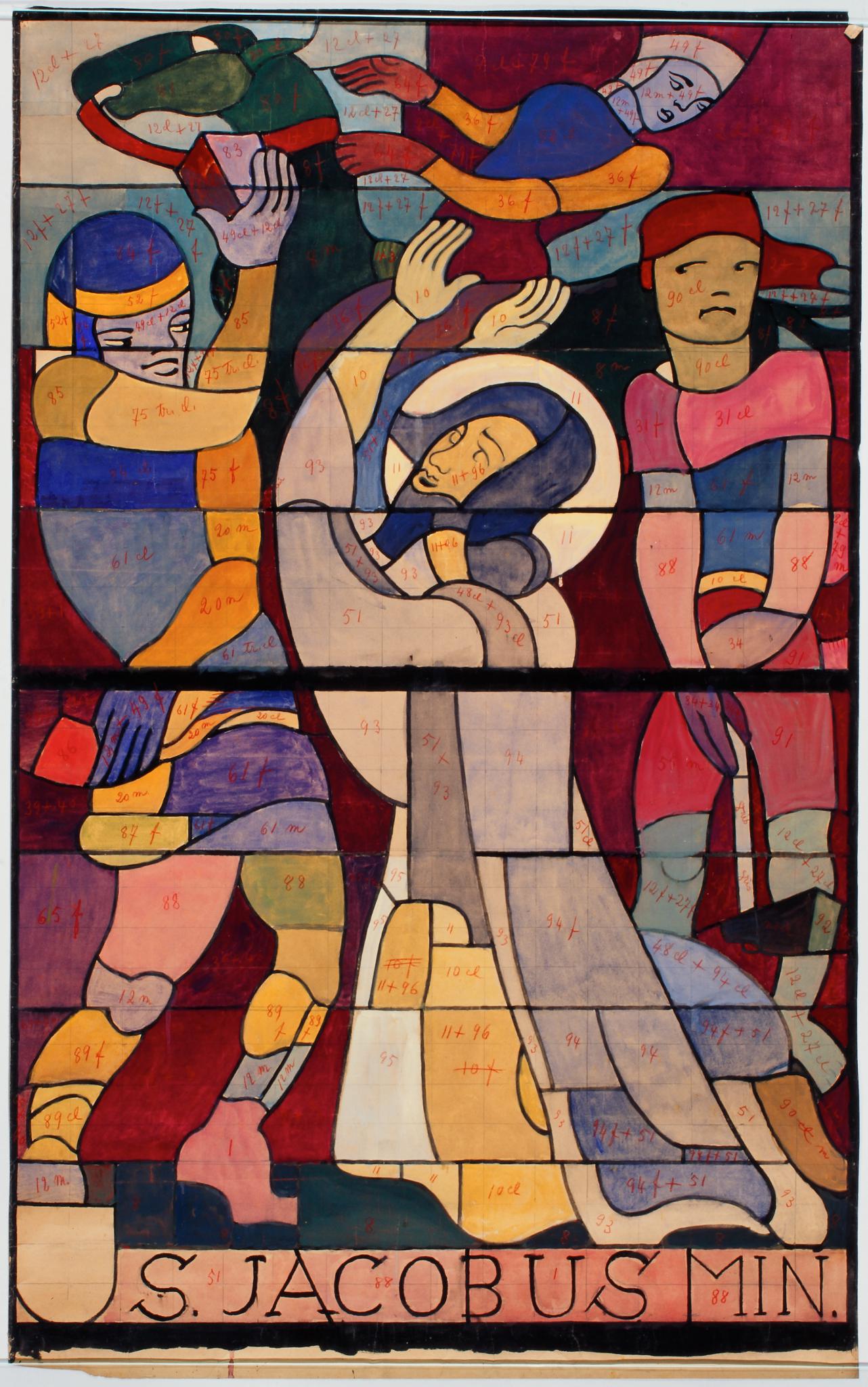 Ce carton en couleur à l’échelle 1:1 est le projet définitif pour la quatrième scène depuis le haut du deuxième vitrail de gauche de la nef de l’église Saint-Pierre de Fribourg, consacré à saint Jacques le Mineur. Elle est tirée de la Légende dorée de Jacques de Voragine (de Voragine, 1902, p. 43).