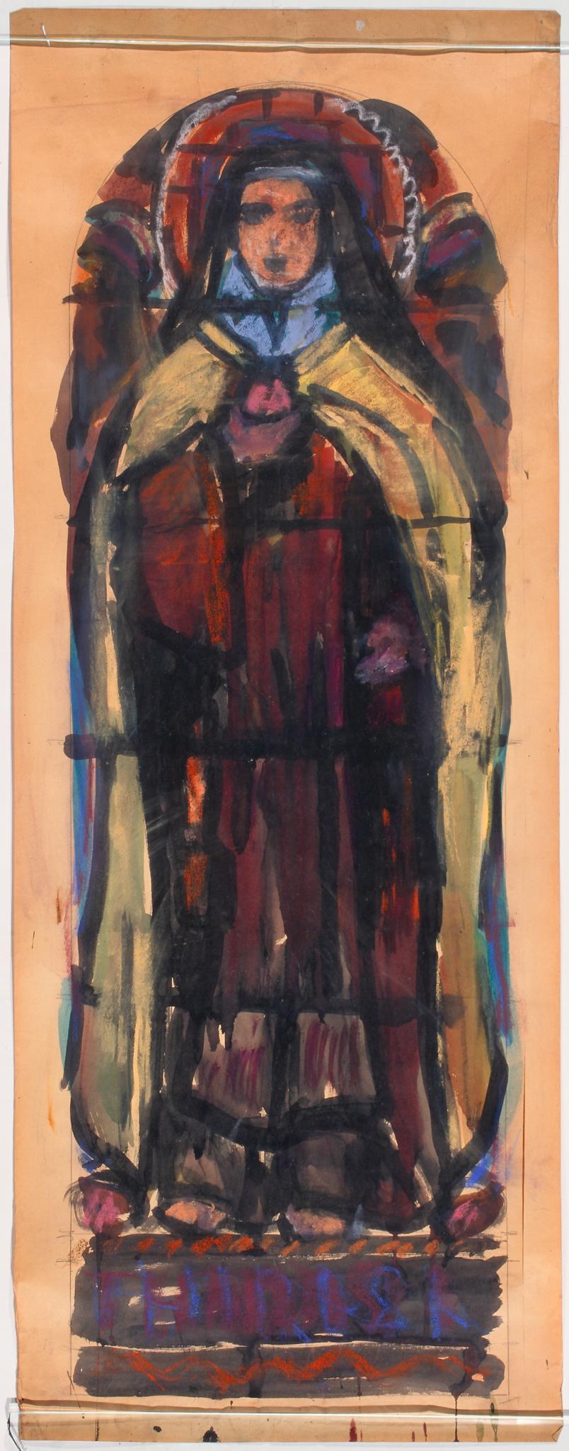 Ce carton est le projet pour la baie centrale de la fenêtre tripartite consacrée à sainte Thérèse de Lisieux, située sur la façade sud-est de la nef de l’église Saints-Pierre-et-Paul d’Orsonnens, construction emblématique de l’architecte du Groupe de Saint-Luc Fernand Dumas, en 1935-1936 (Lauper, 2012, p. 209). L’artiste Alexandre Cingria conçoit l’ensemble des neuf vitraux de la nef en 1939, en collaboration avec le Fribourgeois Willy Jordan (Jordan, 1958, p. 6), auteur de la polychromie générale du sanctuaire, des mosaïques du choeur et de la chaire, des ornements et vêtements liturgiques ainsi que des vitraux du choeur, de la sacristie et du baptistère (Jordan, 1958, p. 2, 5). L’atelier fribourgeois Kirsch et Fleckner réalise l’ensemble des vitraux de la nef.