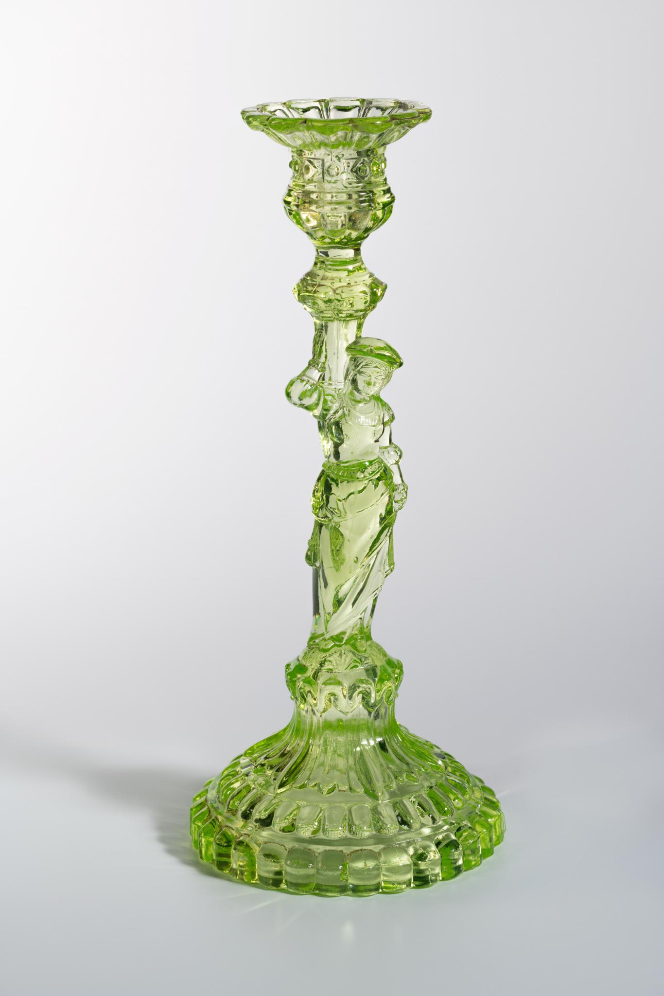 Bougeoir en verre ouraline jaune-verdâtre, avec personnage féminin (cariatide) portant la partie supérieure du bougeoir sur son épaule droite.