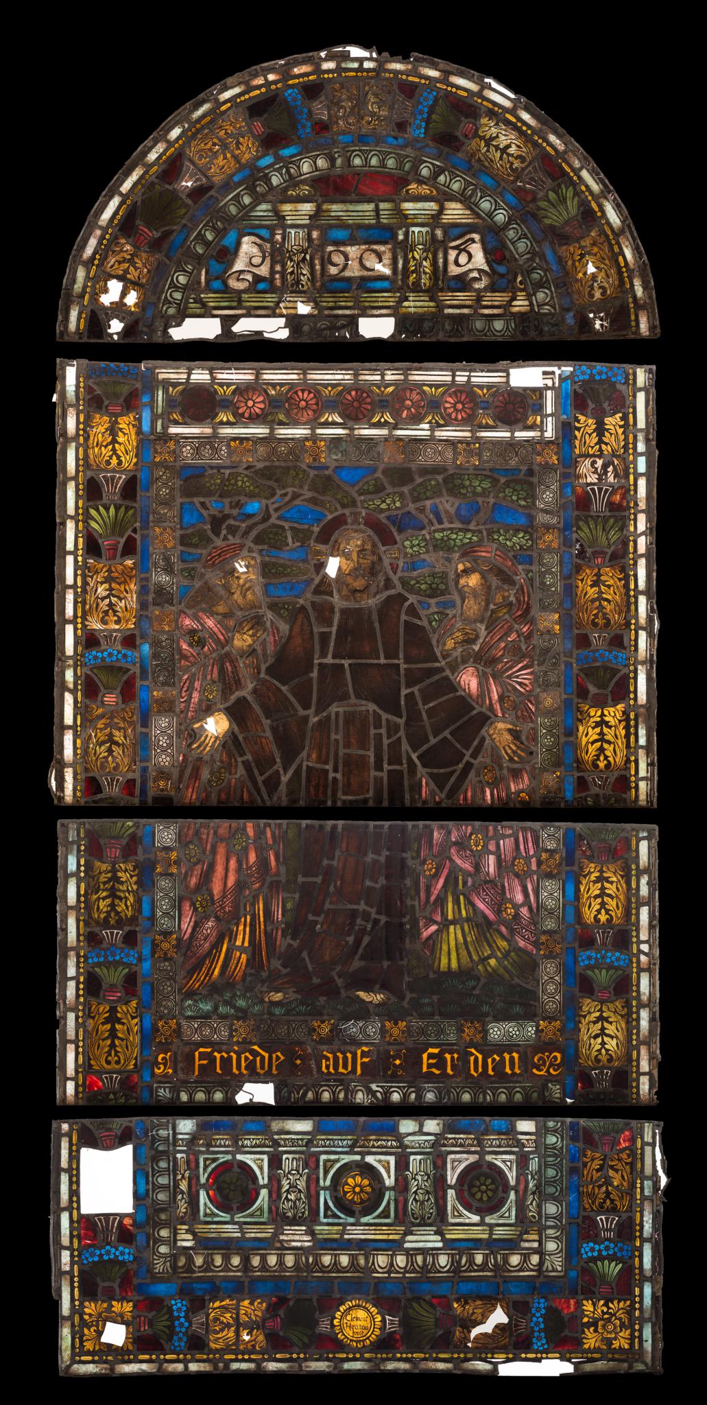 Vitrail au plomb pour une fenêtre en plein cintre composée de quatre panneaux et représentant la Transfiguration. Au premier plan au centre se trouve le Christ, debout, de face, en pied, entouré des prophètes Moïse et Elie. Il est vêtu de brun, les bras écartés, les paumes de main ouvertes. A l’arrière-plan, des “guirlandes” de feuilles vertes décoratives se détachent devant un ciel bleu. Quelques troncs suggèrent des arbres. La riche bordure ornementale montre des motifs floraux et géométriques, une succession de bouquets de fleurs bleues, de rinceaux d’acanthes et de palmettes. La bordure est entourée d’un filet d’encadrement bleu à l’intérieur et transparent à l’extérieur. Dans la lunette (panneau supérieur), l’inscription “1908”, date de réalisation du vitrail; sous la scène figurative, l’inscription “Friede auf Erden”.