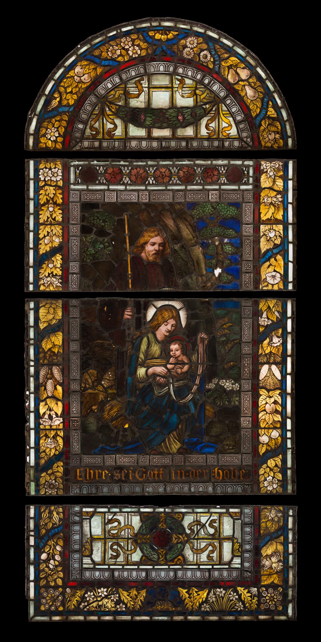 Vitrail au plomb pour une fenêtre en plein cintre composée de quatre panneaux et représentant la Sainte Famille au repos, dans la campagne. La Vierge est assise sur une botte de foin et tient l’enfant Jésus emmailloté sur ses genoux. Joseph est debout derrière eux. A l’arrière-plan, des arbres se détachent devant un ciel bleu. Sur la gauche, deux moutons paissent. La scène, sous laquelle se trouve l’inscription “Ehre sei Gott in der Höhe”, est entourée d’une frise de motifs géométriques (alternance de carrés et de rectangles contenant des rosettes).