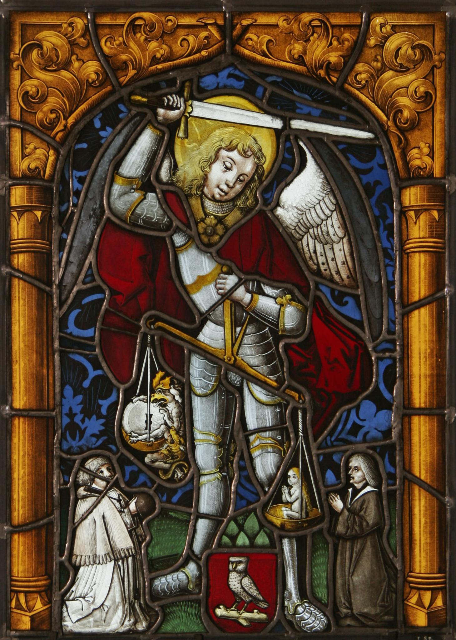 TG_9: Bildscheibe mit Erzengel Michael als Seelenwäger und unbekanntem Wappen (Lienhard Maag?)