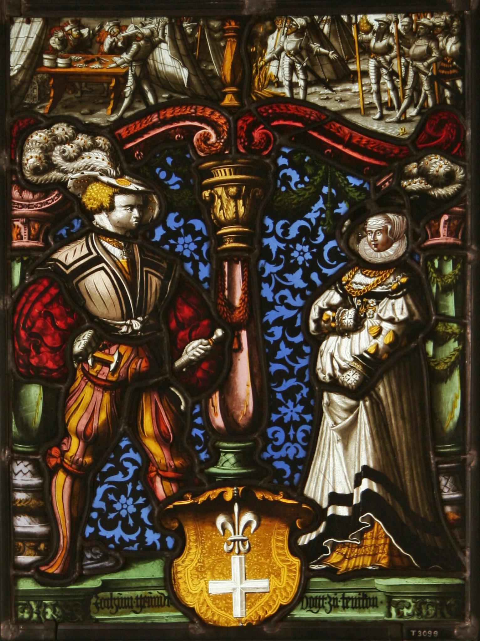 Vor blauem Damastgrund steht sich das Stifterpaar gegenüber. Der seine Gemahlin streng anblickende, mit Schwert und Schweizerdolch bewaffnete Joachim Gründer erscheint in rotem Hemd, weissem Wams, gelben Beinkleidern und weissem Federhut. Seine in der rechten Hand ein Blumensträusschen haltende Frau trägt über ihrem gelben Untergewand eine schwarz gesäumte, weisse Kleidung. Zwei seitliche sowie eine mittlere Säule tragen einen roten Volutenbogen. Im Oberbild ist in zwei Szenen die durch antike Historiographen wie beispielsweise Titus Livius (Ab urbe condita II, 12) überlieferte Geschichte des Römerhelden Mucius Scaevola festgehalten. Links ist zu sehen, wie dieser beim Mordversuch am etruskischen Belagerer Roms, Porsenna, versehentlich dessen Schreiber ersticht. Die rechte Szene schildert, wie Mucius Scaevola als Gefangener Porsennas zum Beweis seiner Furchtlosigkeit vor diesem seine rechte Hand im Altarfeuer verbrennt. Davon beeindruckt, hebt Porsenna danach die Belagerung auf und lässt Mucius frei. Zu Füssen des Stifterpaars befindet sich das mit dem Wappen Gründers belegte und beschriftete Podium.