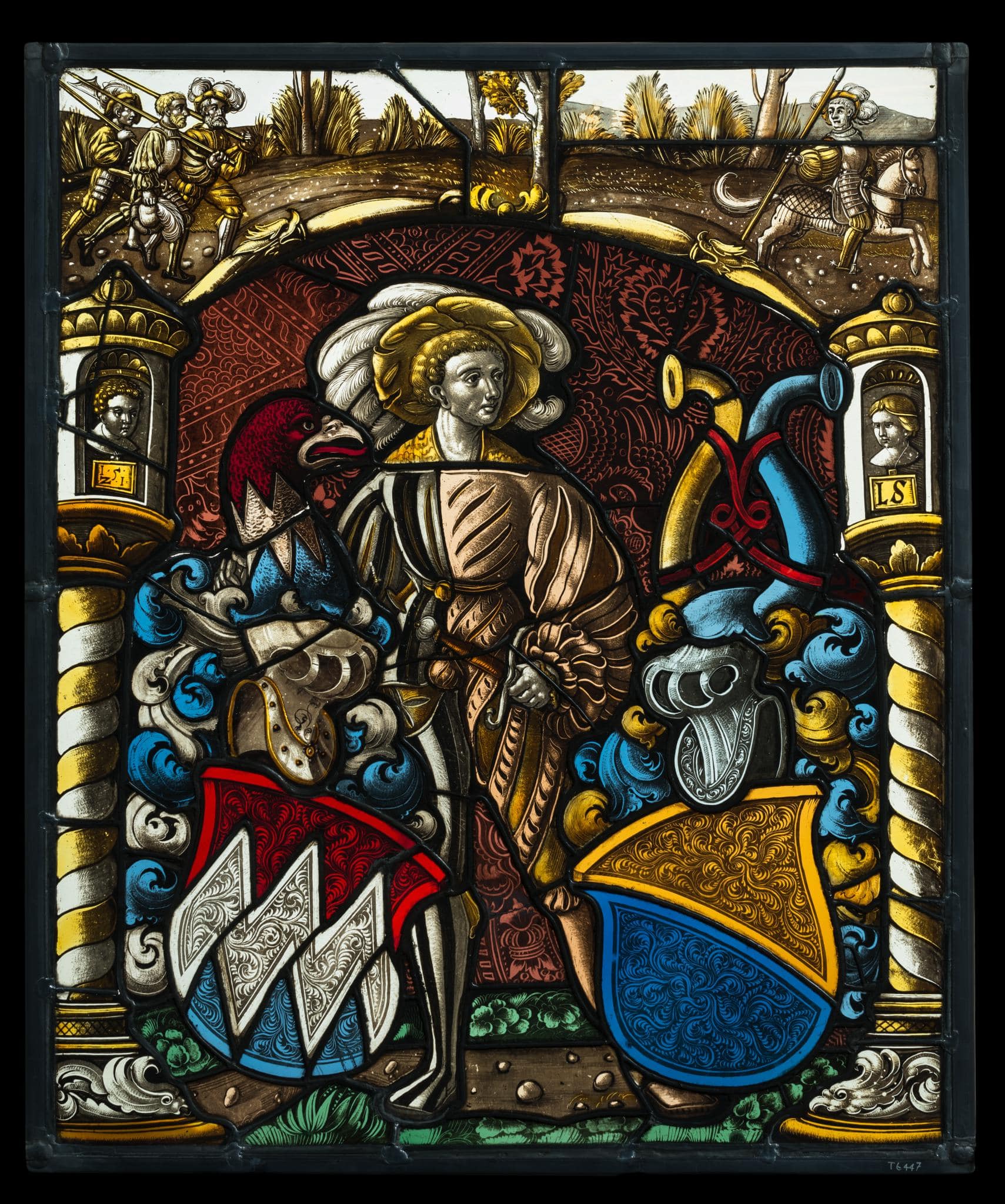 Vor hellrotem Damastgrund steht ein Kriegsmann in geschlitzter Tracht und gelbem Federhut auf einem rasengesäumten Weg als Schildhalter zwischen den sich leicht zuneigenden Vollwappen des Stifterpaares. Daneben erheben sich Spiralsäulen, die je ein kleines Gehäuse mit einer männlichen und weiblichen Büste tragen. Unter diesen Büsten befinden sich das Monogramm des Glasmalers und die Jahreszahl. Über dem aus Löwenköpfen ragenden Bogen verfolgen drei Krieger mit Spiessen und Hellebarde einen Lanze tragenden geharnischten Reiter.