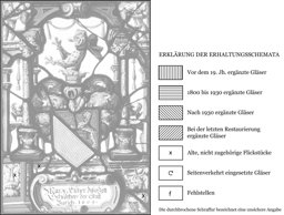 Das Vollwappen Marx Eschers befindet sich über der Rollwerkkartusche mit dem Stifternamen. Rechts von dieser Kartusche steht ein gerüsteter, seine Büchse putzender Knabe, dessen Gegenüber auf der linken Seite durch ein altes Flickstück ersetzt ist. Das zentrale Stifterwappen umfasst eine luftige dreiachsige Arkade vor farblosem Grund. Auf ihrem Gebälk ist in den oberen Ecken je ein Putto postiert. Scharf beäugt werden diese beiden Engelknaben von den zwei Adlern auf der Balustrade unterhalb von ihnen.