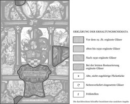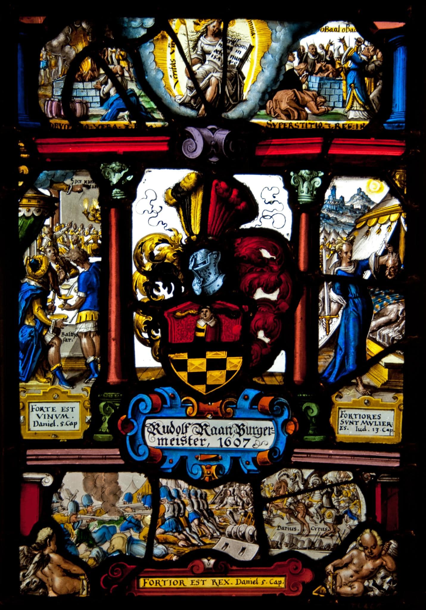 Säulen und Gebälk teilen die Scheibe in fünf Felder. Im mittleren befindet sich vor farblosem Grund das Vollwappen Hans Rudolf Rahns über der blauen Rollwerkkartusche mit der Stifterinschrift. Links davon sind das Gastmahl des Belsazar (Dan, Kap. 5) und rechts Judith mit dem Haupte des Holofernes' (Jdt, Kap. 13) dargestellt. Im Oberbild thront die Allegorie der Veritas, und zu ihren Seiten ist die Geschichte von Elias und den Baalspriestern dargestellt. Links kniet Elias vor dem von seinem Herrn entzündeten Altarfeuer, während auf der anderen Seite die um den Altar versammelten Baalspriester vergeblich auf die Feuerantwort ihres Gottes warten (1 Kg 18, 37–39). Im untersten Bildfeld ist zwischen zwei Putten mit Stundengläsern die Eroberung von Belsazars babylonischem Reich durch Darius und Cyrus dargestellt (Dan, 5. Kap.).