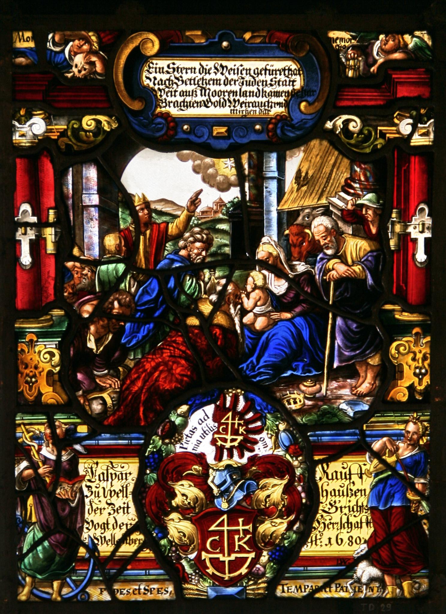 Hasler, R., & Keller, S. (2020). Bildscheibe Kaspar Kauf (Kauff) mit Anbetung der Heiligen Drei Könige. Dans Vitrosearch. Consulté le 5 décembre 2025 de https://www.vitrosearch.ch/objects/2655912.