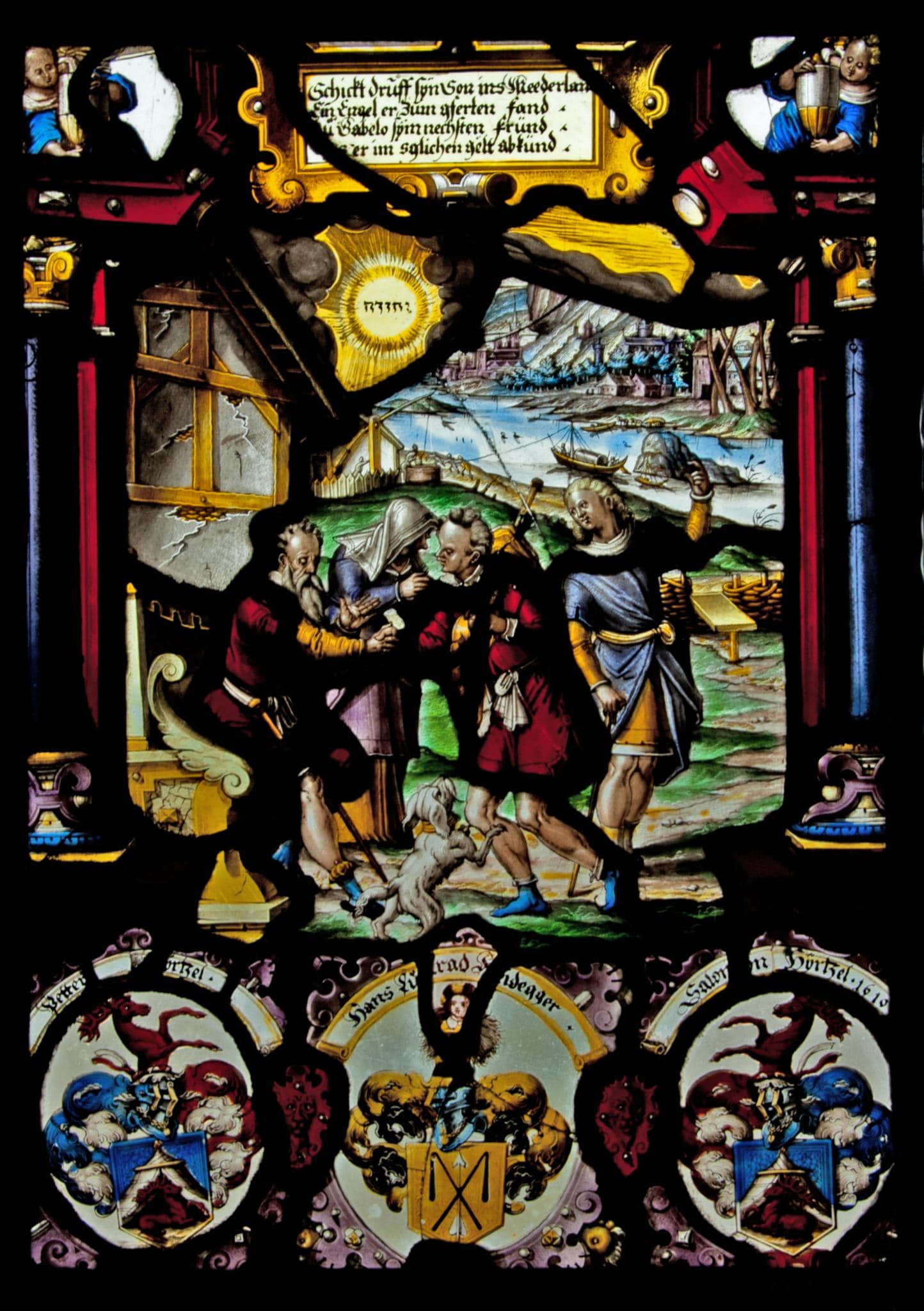 Das Historische Museum des Kantons Thurgau besitzt zwei Bildscheiben von 1610, wovon die eine die Erblindung des alten Tobias (TG_52) und die andere Tobias beim Abschied von seinen Eltern (TG_49) darstellt. Salomon Hirzel, einer der Auftraggeber des vorliegenden Glasgemäldes, heiratete im Jahr 1627 die Witwe des Hans Ulrich Wolf, der 1610 zusammen mit Hans Jakob Gessner die andere der beiden genannten Scheiben bestellt hatte (TG_52). Die drei Stifter der vorliegenden Scheibe sowie die zwei Stifter der zugehörigen Scheibe waren alle Zunftmeister und damit auch Mitglieder des Grossen Rates von Zürich. Die beiden Scheiben werden 1610 demnach an den gleichen unbekannten Ort gestiftet worden sein. Dafür spricht auch, dass sie auf einer umfangreichen, von Christoph Murer gegen 1600 in Zürich geschaffenen Serie von Rissen zur Tobias-Geschichte beruhen. Sechs davon haben sich im Kunsthaus Zürich erhalten (Vignau-Wilberg, 1982, S. 30f.) und ein weiterer, derjenige mit der Erblindung des alten Tobias, gelangte über die Sammlung Wyss aus Bern ins British Museum in London (Inv.Nr. 1899,0120.35; britishmuseum.collection.org). Es ist durchaus möglich, dass die beiden Glasgemälde von 1610 in Frauenfeld ursprünglich zu einem umfangreicheren, nach den Vorlagen Murers gestalteten Tobias-Zyklus für Zürcher Zunftmeister und Grossräte gehörten. Bei den beiden im Historischen Museum befindlichen Scheiben dürfte es sich um Arbeiten aus Murers Zürcher Werkstatt handeln, wobei als ausführende Hand wohl eher Josias denn Christoph Murer in Frage kommt.