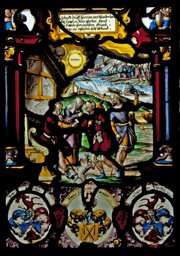 Bildscheibe Peter Hirzel, Salomon Hirzel und Hans Konrad Heidegger mit dem jungen Tobias beim Abschied von seinen Eltern