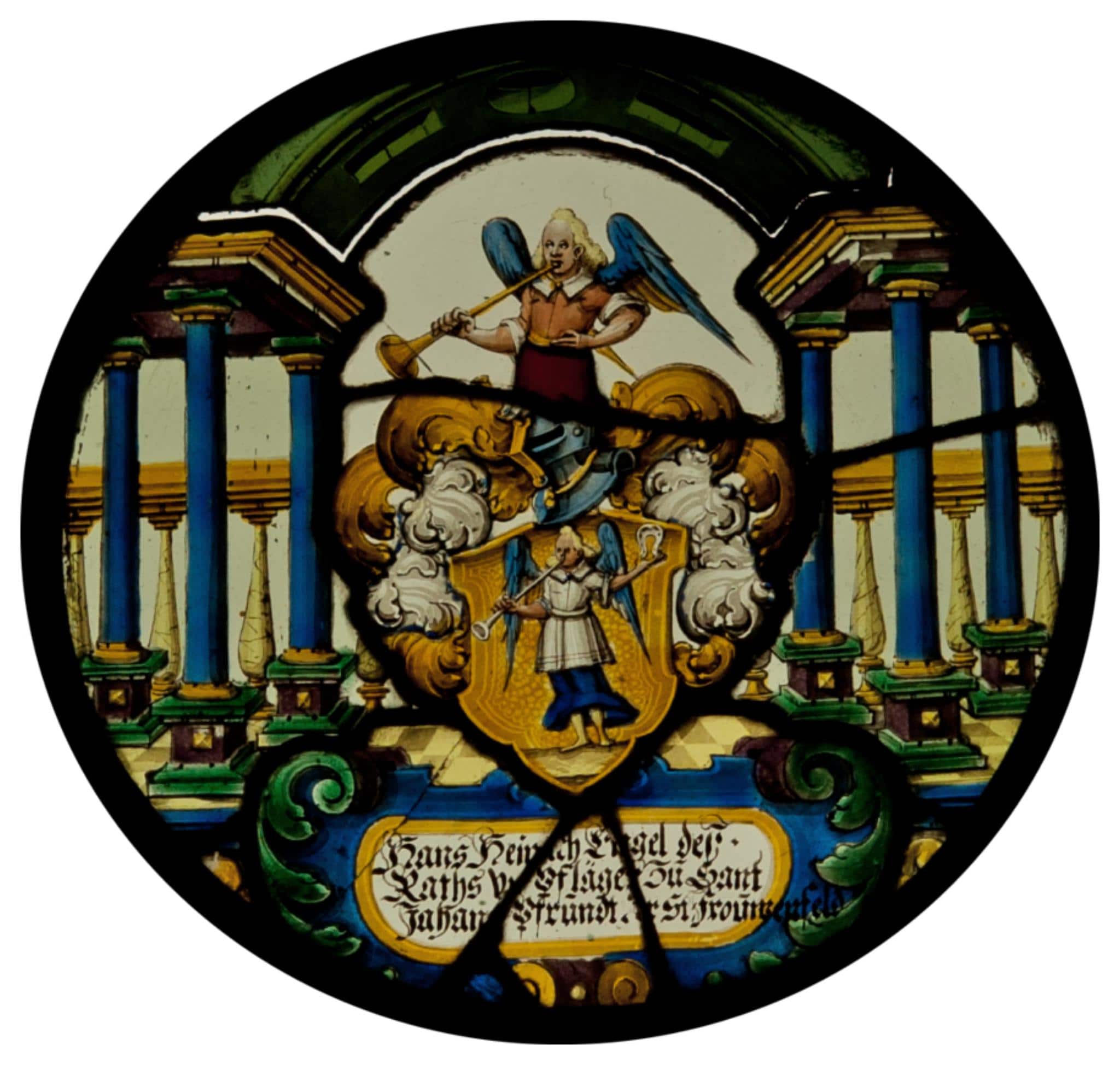 Engels Wappenstiftung ist ähnlich komponiert wie die runde Allianzwappenscheibe Jakob Hubers und Elisabeth Ebneters von 1657 in Schloss Altenklingen (TG_199) und auch in stilistischer Hinsicht vergleichbar. Wie diese stammt auch die Rundscheibe Engels vermutlich aus der Zürcher Werkstatt des Hans Jakob II. Nüscheler.