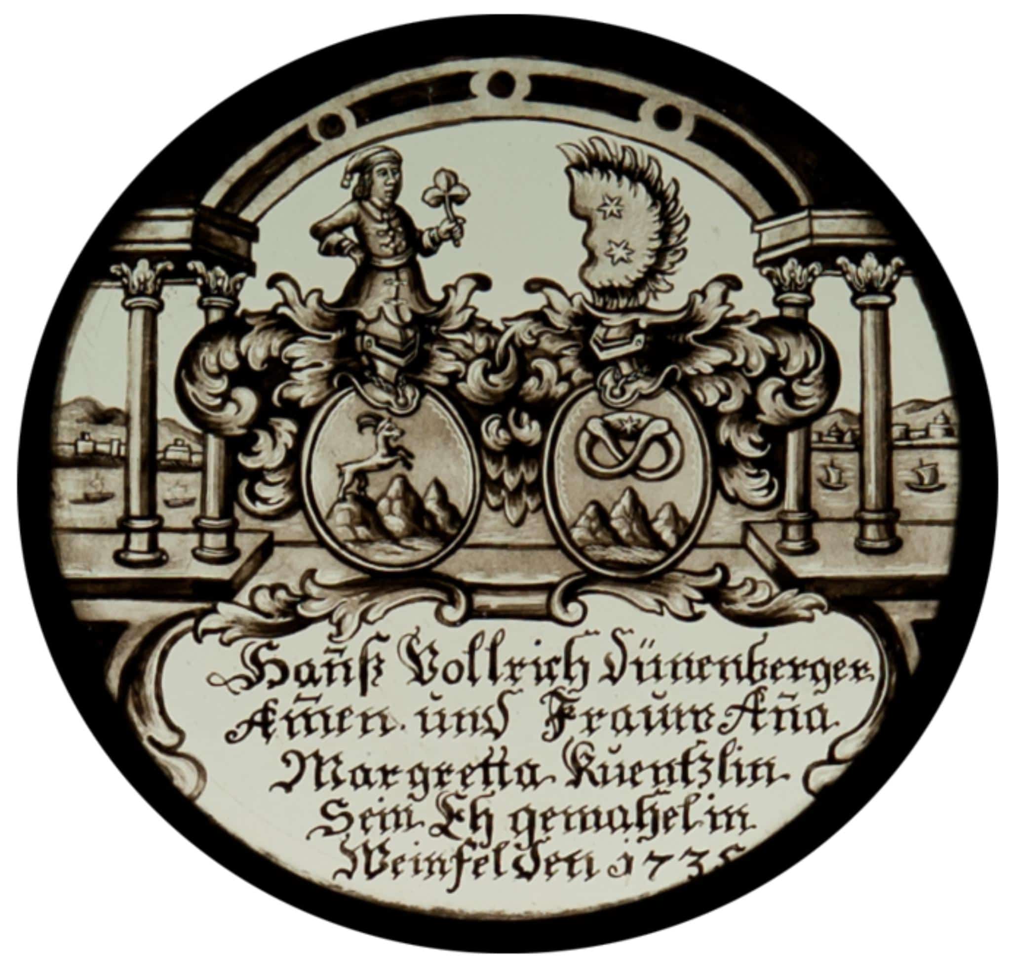 Hasler, R., & Keller, S. (2020). Runde Allianzwappenscheibe Hans Ulrich Dünnenberger (Dünenberger) und Anna Margaretha Küenzli (Künzli). Dans Vitrosearch. Consulté le 5 décembre 2025 de https://www.vitrosearch.ch/objects/2656447.