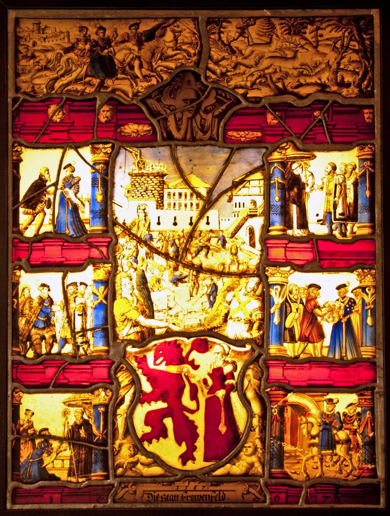 Die Rechnungsbücher der Stadt Frauenfeld (Bürgerarchiv Frauenfeld, Rechenbuch D1) verzeichnen die Stiftung im Jahr 1567 nicht. 1567/68 stiftete die Stadt Wil eine von Jos Murer geschaffene, ganzbögige (40 x 30 cm) Scheibe in das Haus des “Rüöbly” in Frauenfeld (Seckelamtsrechnung Wil 1567/68, No. 791; Boesch, 1949, S. 10). In den Eidgenössischen Abschieden des Jahres 1571 ist das Gesuch des Ammanns Ruppli zu Frauenfeld um Schenkung von Fenstern mit den Wappen der Orte in sein neues Haus festgehalten (Eidgenössische Abschiede, 4,2, S. 1054). Und im selben Jahr, 1571, ist die Stiftung einer Zürcher Standesscheibe in das Haus des Ammanns Rüplin in Frauenfeld, hergestellt von Heinrich Werder, belegt (Meyer, 1884, S. 235). Der reichenauische Ammann Joachim Rüpplin (†1589), Sohn des Job, war verheiratet mit Barbara Locher von Freudenberg und erwarb 1555 die Güter der ehemaligen Burg Helfenberg bei Buch bei Frauenfeld sowie 1566 die niederen Gerichte Kefikon und Islikon. 1567 kaufte er den hinteren (alten) Strasshof in Frauenfeld, der sich davor in Besitz des Klosters Reichenau befunden hatte, und errichtete im zweiten Obergeschoss einen repräsentativen Festsaal (Rathaus Frauenfeld, 1983, S. 90–91; Knoepfli, 1950, S. 152; Trösch, 2010; vgl. TG_255). Für diesen reich mit ornamentaler Malerei dekorierten Saal waren die in den Quellen belegten Fensterstiftungen bestimmt. Sicherlich stiftete damals auch die Stadt eine Scheibe in das neuerworbene Haus des prominenten Bürgers. Vielleicht handelt es sich dabei um das vorliegende, ebenfalls ganzbögige Glasgemälde.