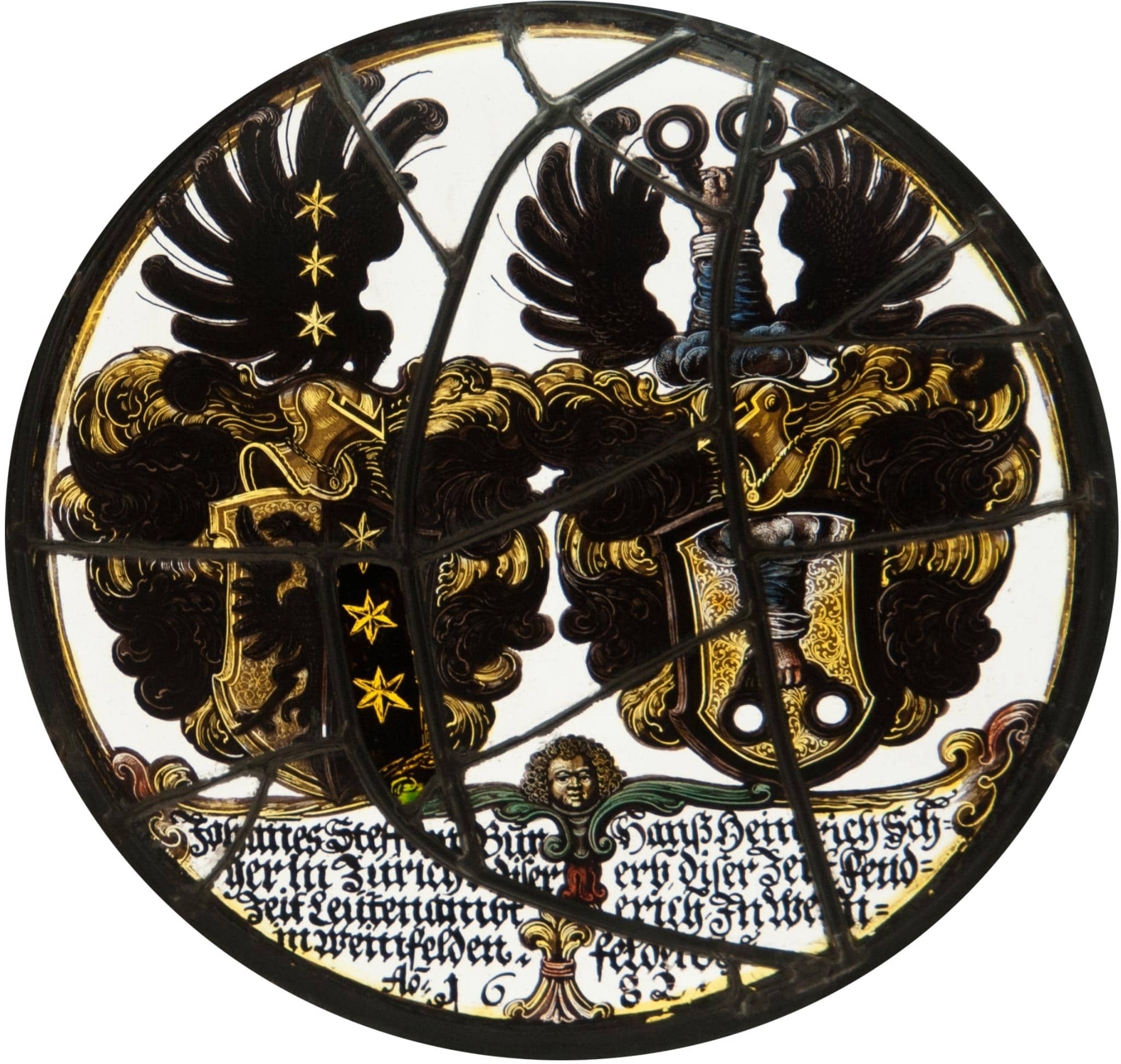 Der 1682 erfolgte Neubau des Weinfelder Schützenhauses bot Anlass zu zahlreichen Fenster- und Wappenstiftungen. Dies belegt das vom damaligen Schützenmeister Hans Jakob Düssli angelegte Protokoll, worin dieser insgesamt sechzehn 1682 dorthin verehrte Fenster mit Angabe ihrer Stifter verzeichnete. Wie daraus hervorgeht, schenkte jedes Mitglied der Musketenschützengesellschaft allein oder mit einem Kollegen ein Fenster mit seinem Wappen in deren neues Haus. Die meisten der Stifter finden sich mit ihrem Wappen auch auf dem Glasgemälde, das die Gesellschaft für dort anfertigen liess (TG_79). Als Schöpfer der 1682 entstandenen Scheibenfolge für das Weinfelder Schützenhaus ist Wolfgang Spengler bezeugt. Seine Signatur zeichnet die meisten der zum Zyklus zählenden Werke aus. Laut der von der Schützengesellschaft aus dem Jahre 1682 erhaltenen Rechnung wurden die betreffenden Scheiben zu 5 Batzen pro Stück in dessen Konstanzer Werkstatt hergestellt und gebrannt (Brüllmann, 1947, S. 177f., Anm. 3; Lei, 1983). Weil der Zyklus mehrheitlich kleine Rundscheiben mit einem oder zwei Stifterwappen umfasst, muss sich der Stückpreis von 5 Batzen auf diese beziehen. Für die beiden den Zyklus vervollständigenden grossen rechteckigen Glasgemälde, welche die Schützengesellschaft selbst (TG_79) sowie Zürichs Obervogt Hans Kaspar Hirzel (TG_1457) bei Spengler in Auftrag gaben, wird dieser hingegen bestimmt mehr verlangt haben.